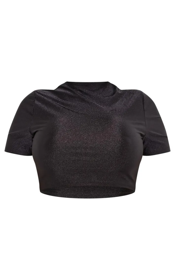 Keep it simple yet stylish with this crop top. Featuring a black disco material with short sleeves, a cropped length and a sculpting fit, we’re in love. Wear with the matching skirt, black knee-high boots and accessories for an insta-worthy combo.