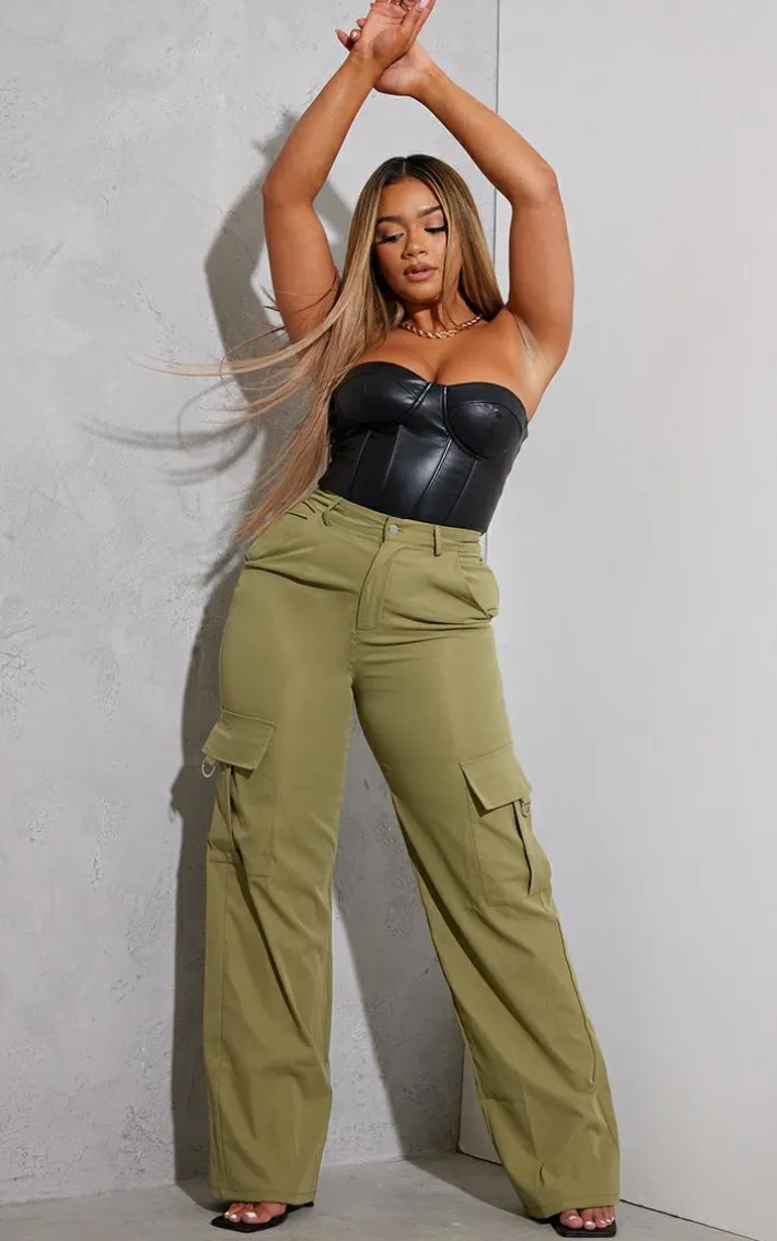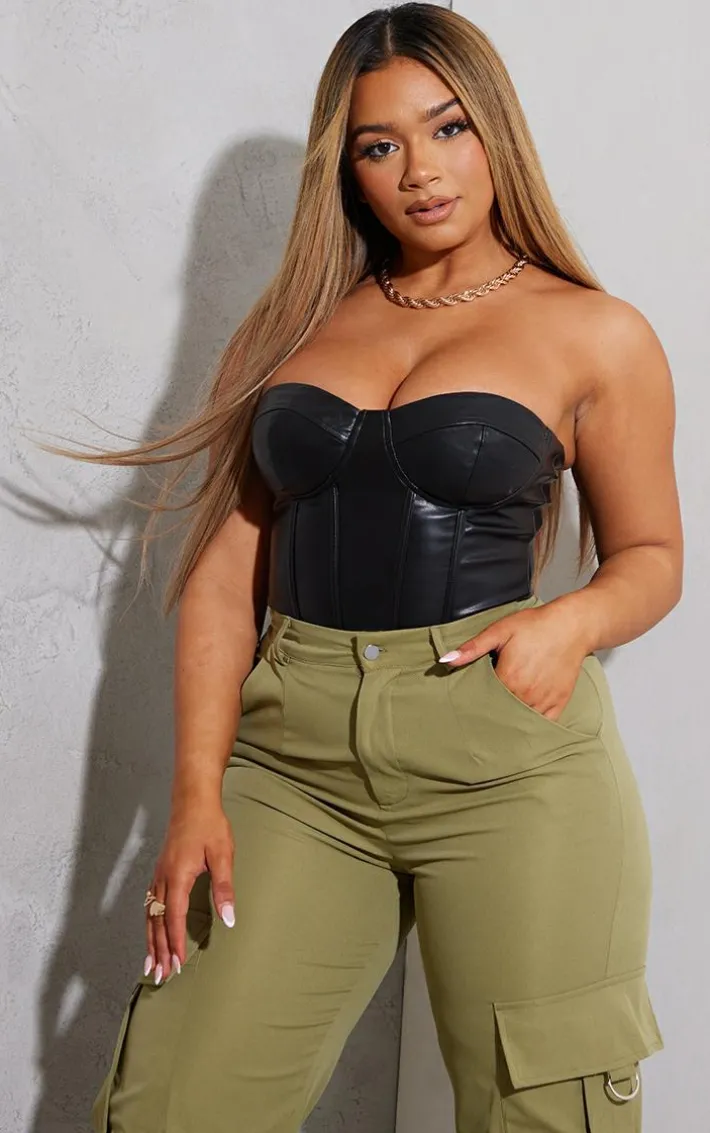 Earn some serious style points in this corset. Featuring a black faux leather material with a bandeau design, what’s not to love? Style with cargo bottoms, barely-there heels and gold accessories for the ultimate finish.