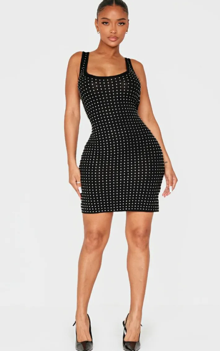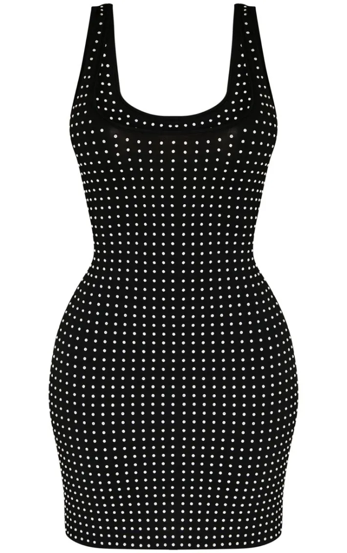 Show off your shape with this shape black hot fix scoop neck mini dress. Brought to you in a black hot fix material with a scoop neck design and a mini length, all eyes are sure to be on you. Team with a pair of court heels and your fave accessories for a look like no other. It’s a yes from us.
