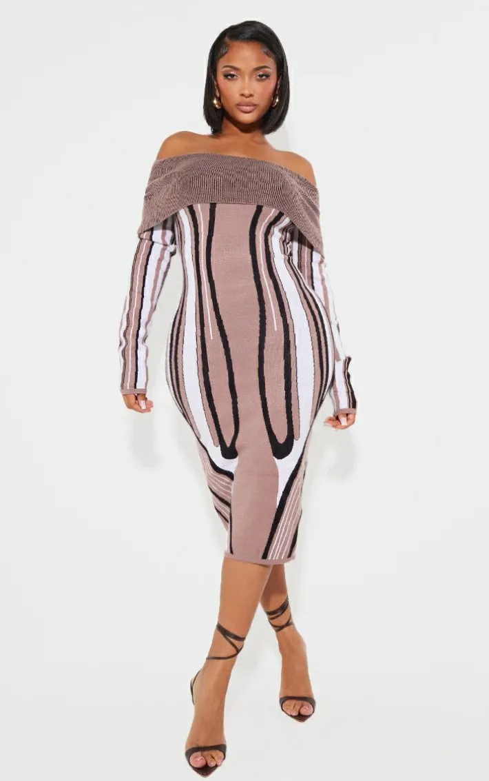 Take your look to a whole knew level with this shape black knit abstract print bardot midaxi dress. Brought to you in a black knit material with an abstract print design and a bardot fit, we are seriously obsessed doll. This midaxi dress pairs perfectly with your fave heels and accessories for a fool proof finish.