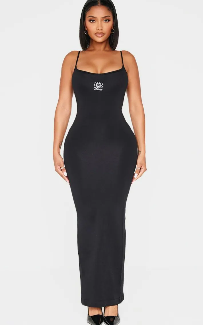 Feel confident in this shape black logo seamless maxi dress. Brought to you in a black seamless material with a logo detailing and a maxi length, you are sure to be showing off your shape in all the right places. Team this shape dress with a pair of clear heels and accessories of your choice to elevate your look even further.