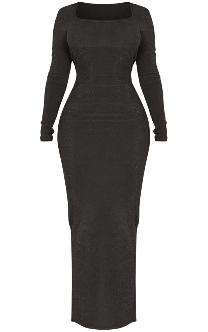When the weekend calls for all the glam vibes, this shape black lurex glitter long sleeve maxi dress will have you showing off your confident side. It is made using a black lurex glitter material with long sleeves and a figure-worshipping fit, we’re in love. Style this shape maxi dress with slip-on heels and a diamante detail bag for a look that is perfect for your next big event and beyond.