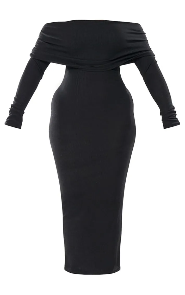 Take on your weekend the right way with this statement shape black rib bardot long sleeve maxi dress. Made from a black rib material anda bardot design, this is everything weÂ’re loving and more. With itÂ’s figure-hugging fit this long sleeve maxi dress is sure to hug you in all the right places. To complete the look style this seamlessly with a pair of heels and accessories of your choice or a look that will secure you all the likes.
