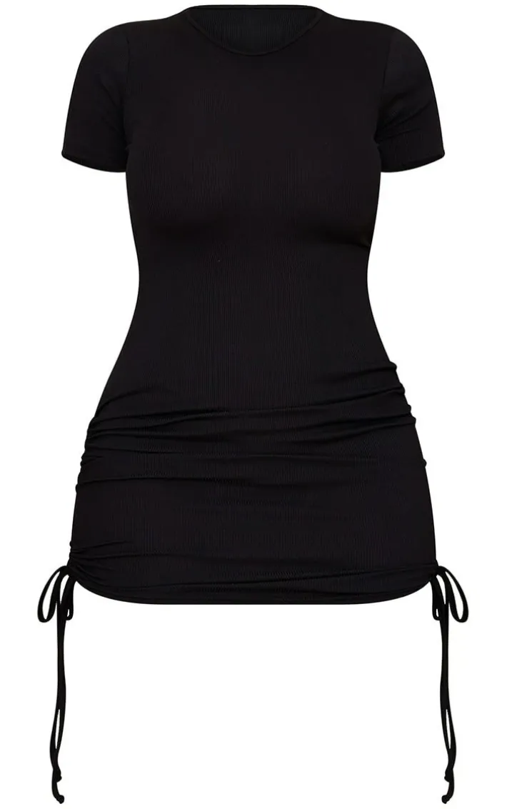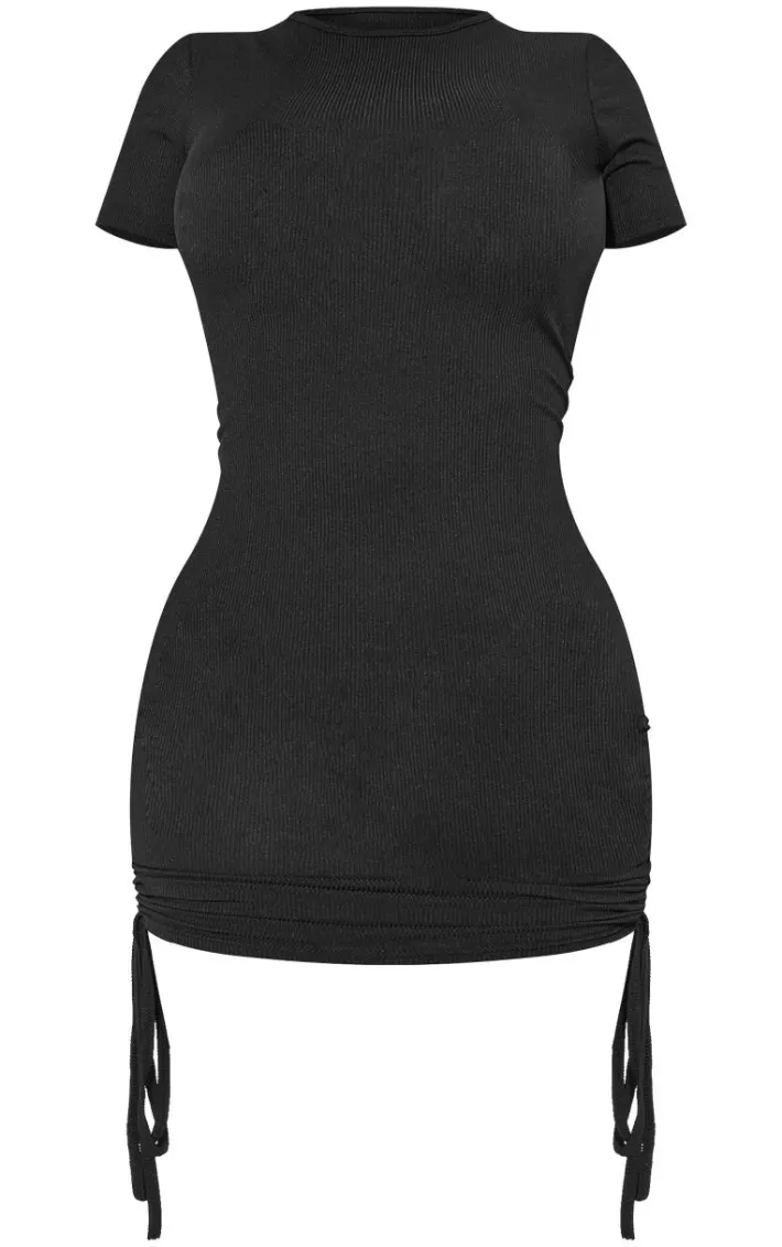 This dress is everything we are loving for effortless day to night styling. Featuring a black ribbed material with a ruched side design and short sleeves. Wear with fresh kicks and your fave accessories for a next level look.