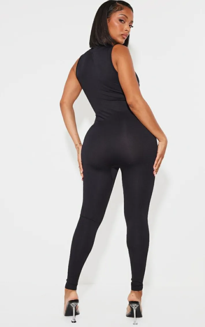 Take your outfit of the day to a whole new level with this shape black stretch seamless zip front sleeveless jumpsuit. This jumpsuit is brought to you in a black stretchy material with a seamless design, a zip front and a sleeveless style, what more could you ask for? This jumpsuit is here to banish any of your what-to-wear dilemmas. Pair with your box-fresh kicks or chunky boots for a look that won’t let you down.