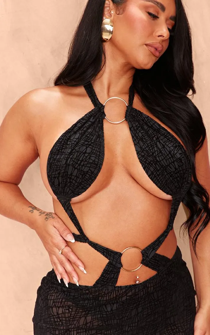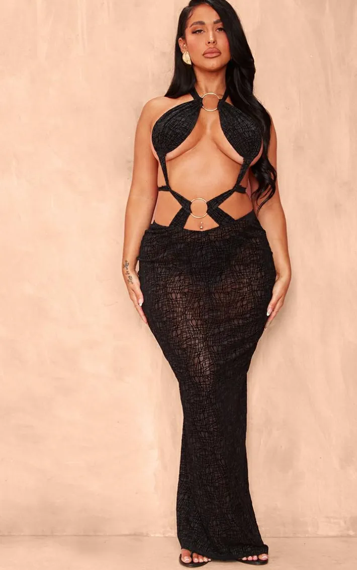 Get ready to have all eyes on you with this shape black textured sheer halterneck ring detail maxi dress. This dress is brought to you in a black textured sheer material with a halter neckline, ring detail and a maxi length, what more could you ask for? This maxi dress with it’s figure-hugging fit will have you being the topic of everyone’s conversation. Wear with your dreamy high heels and accessories for a look that we can’t stop crushing on this season.