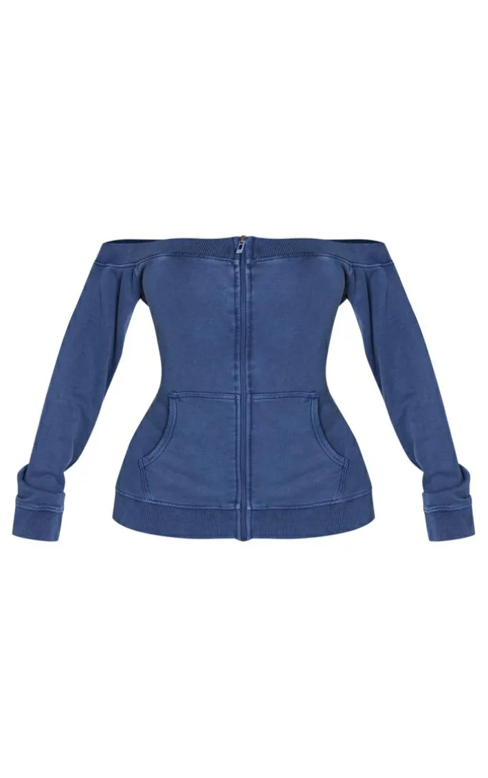Keep your weekend look on point in these shape blue washed bardot zip up sweatshirt. This shape sweatshirt features a blue washed material with a zip-up fastening and a bardot neckline, how could you not be obsessed? Super easy to dress up for the weekend, this shape sweatshirt is the ultimate wardrobe must-have. Team with the matching sweatpants and clear heels to seal the look.