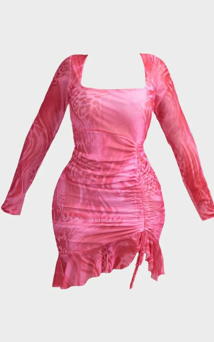 Get ready to make a serious style statement in this shape bright pink abstract leopard mesh ruched side frill hem bodycon dress. Made from a bright pink mesh material with an abstract leopard print design, ruched side detailing and a frilled hem, how can you resist? Style this mesh bodycon dress with your highest heels and some gold accessories to elevate the look.