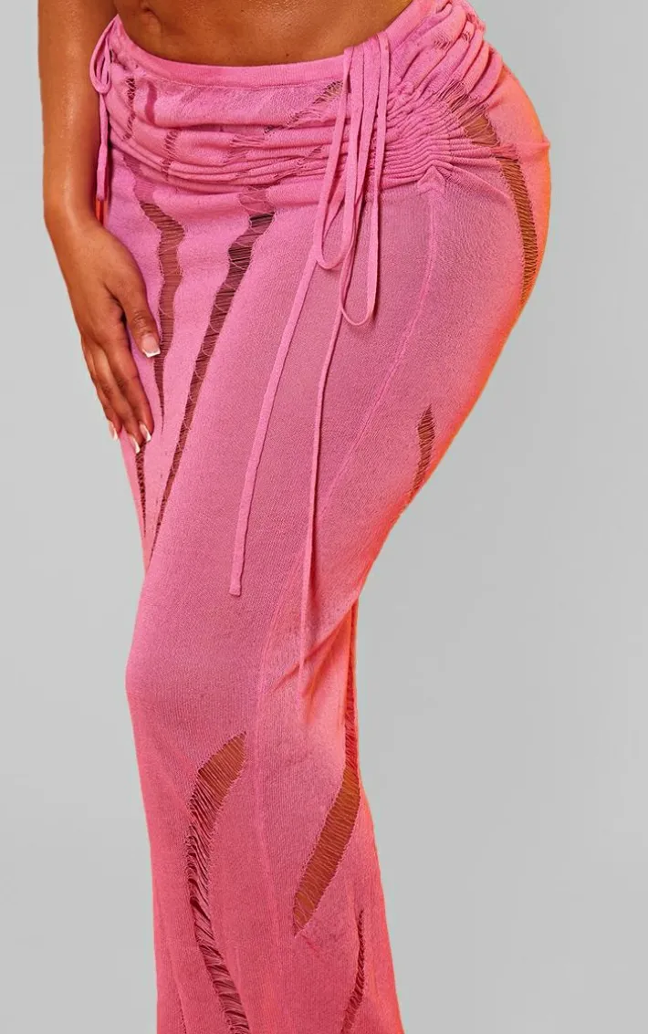 Get your glam on with this shape bring pink knit ladder detailed low rise ruched side maxi skirt. Made from a bright pink knit material with ladder detail, a low rise, a ruched side and a maxi length, youÂ’re sure to have all eyes on you. When the weekend calls so does this maxi skirt. So what are you waiting for? Shop the look and opt for the matching bralet. This look will have you setting trends wherever you step foot.