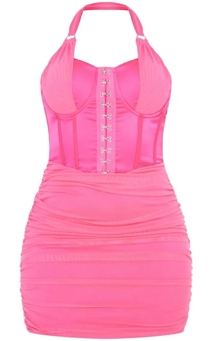 Dare to steal the show this season with this shape bright pink satin hook and eye ruched bodycon dress, get ready to show off your confident side. This shape bodycon dress features a bright pink satin material with a hook and eye design and ruched detailing, what more could you want? Team this bodycon dress with heeled mules and your fave accessories for a combo we’re crushing on.