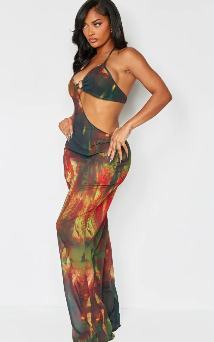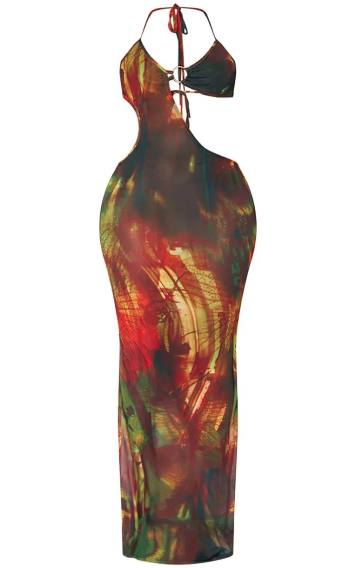 Turn heads for all the right reasons in this shape brown abstract printed chiffon ring detail maxi dress. Brought to you in a brown chiffon material with an abstract printed design and ring detail, this maxi dress is obsession worthy. Style with gold accessories and your fave heels for a look that won’t miss this season.