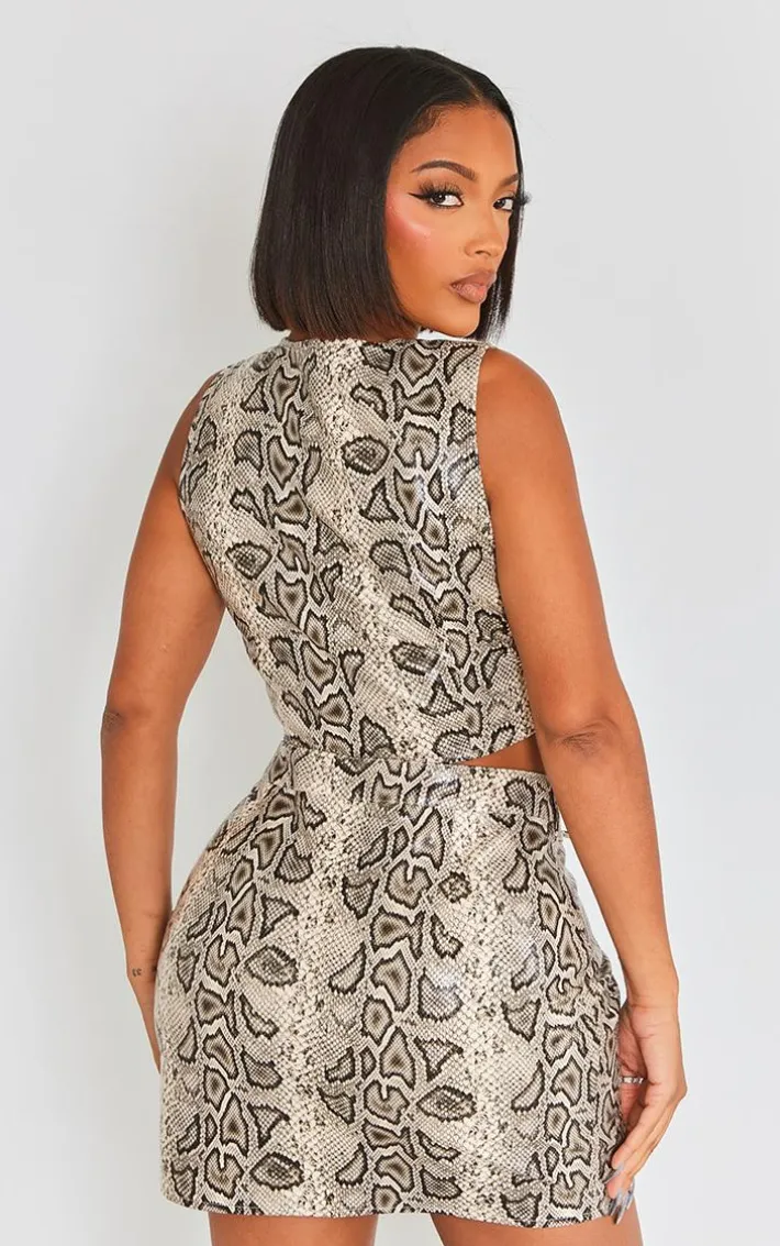 Dare to stand out from the crowd in this shape brown faux leather snake print zip front top, we’re seriously in love. Made using a brown faux leather material with a snake print and a zip front design, it’s a definite yes from us. Style this shape faux leather top with the matching skirt, high heels and minimal accessories for a next level look.