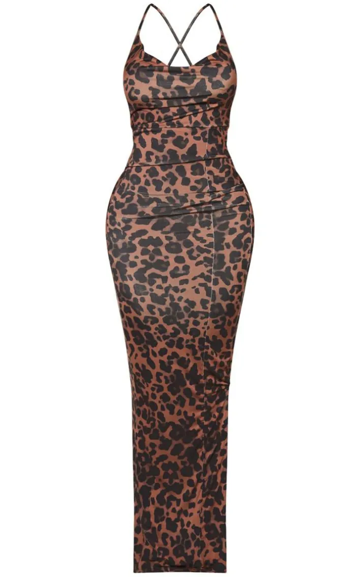 Show off your shape in this fierce maxi dress. Featuring a brown leopard print slinky material with a cowl neckline and a figure-flattering fit, we’re obsessed. Team this with a pair of strappy heels and some simple accessories for a look we are loving.