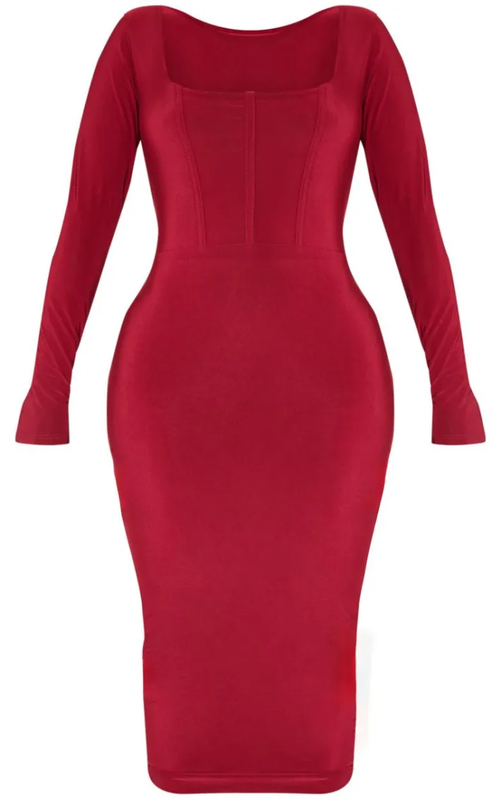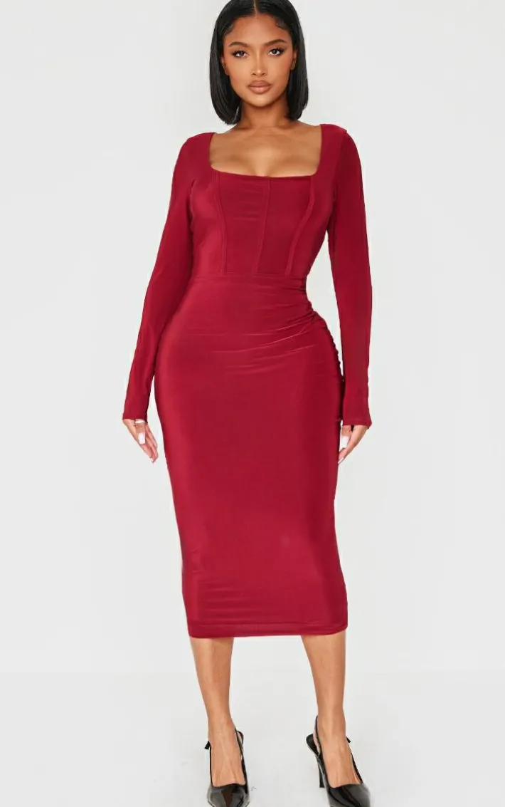 Show off your figure in this statement midi dress. Featuring a burgundy slinky material with long sleeves and a figure-hugging fit. Style this with barely-there heels and drop earrings to complete the look.