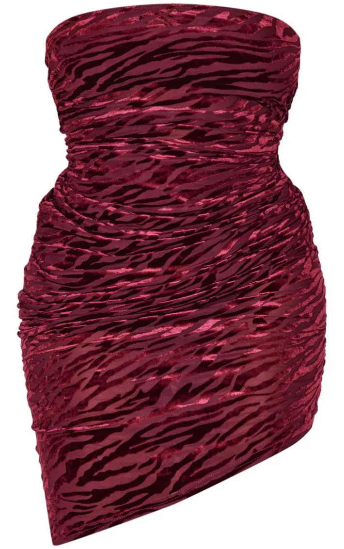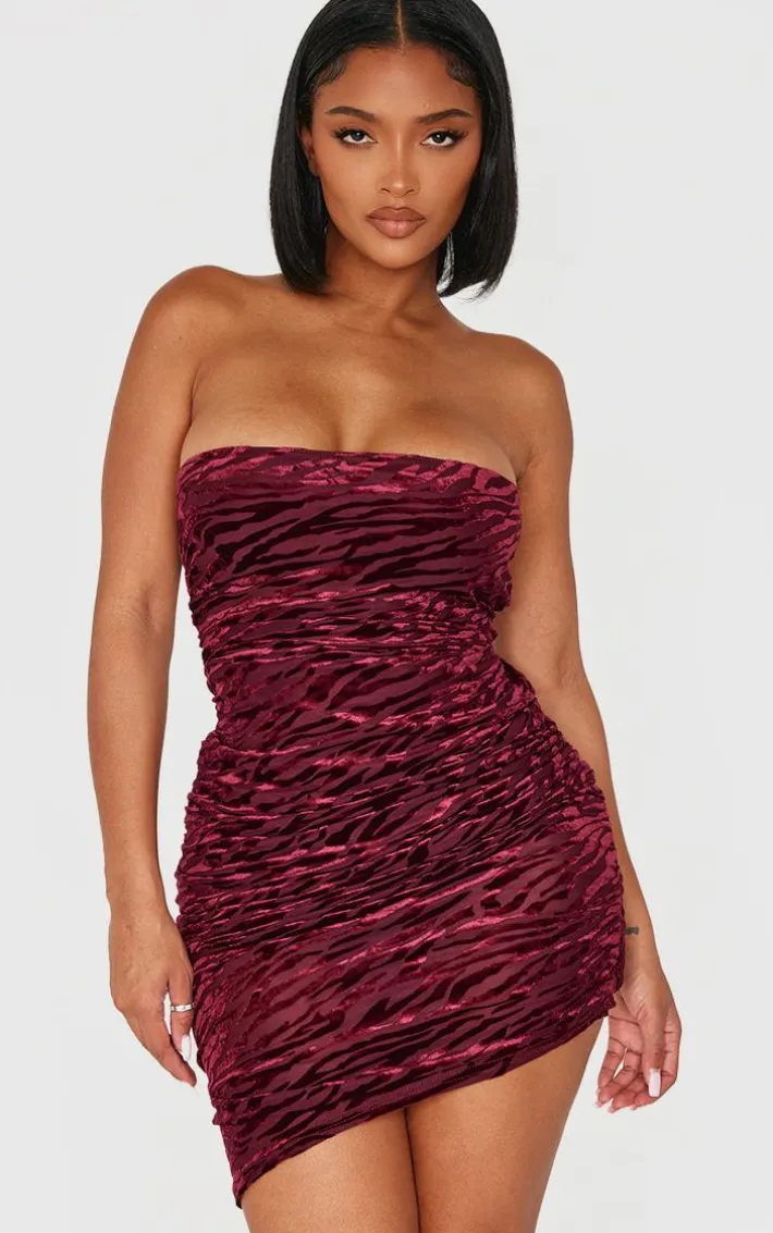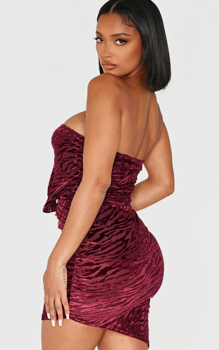 Bring all the luxe devore feels to your weekend wardrobe with this shape burgundy zebra devore bandeau ruched side mini dress. Brought to you in a burgundy hue zebra devore material with a bandeau neckline and ruched side detailing, how can you resist? Simple add court heels and simple gold accessories to elevate the look we’re loving.