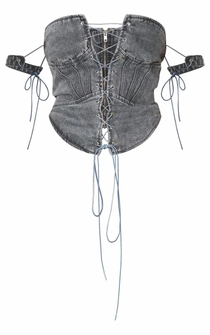 Amp up your weekend look with this shape charcoal wash denim lace up front corset. Brought to you in a charcoal wash denim material with a lace up front design and a flattering corset fit, how can you resist? Style this denim corset with cargo jeans, heels and statement accessories for a look that is sure to have all eyes on you.