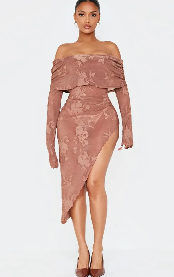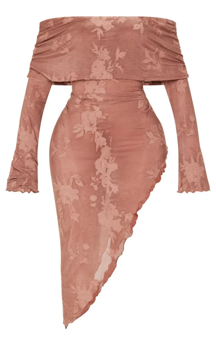 You are guaranteed to turn heads int his shape chocolate floral devore fold over asymmetric long sleeve midaxi dress. Made from a chocolate floral devore material with a fold over bardot design, long sleeves and a midaxi fit, how can you resist? Elevate the look with court heels and gold accessories for the perfect finishing touch.