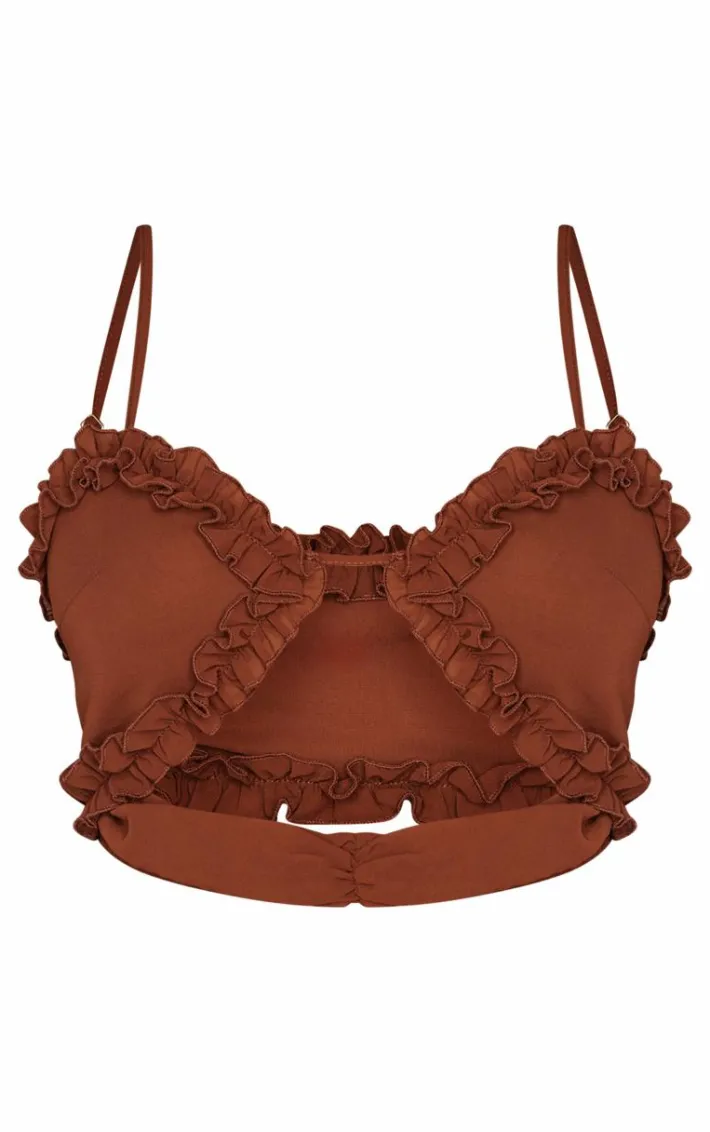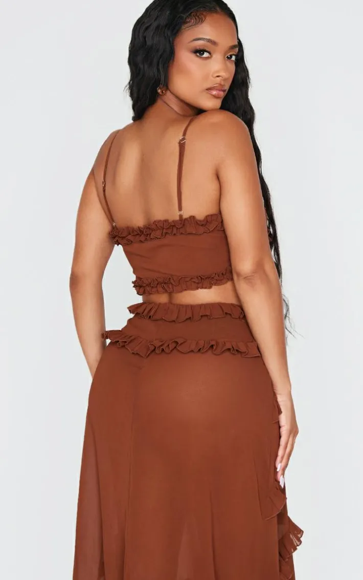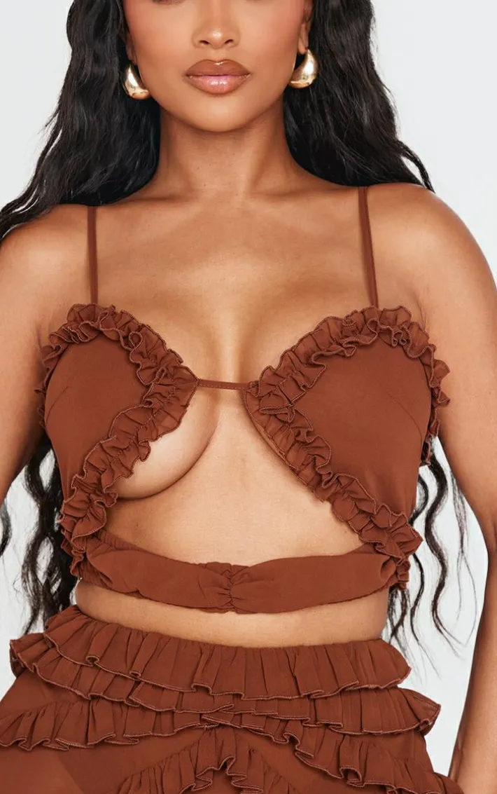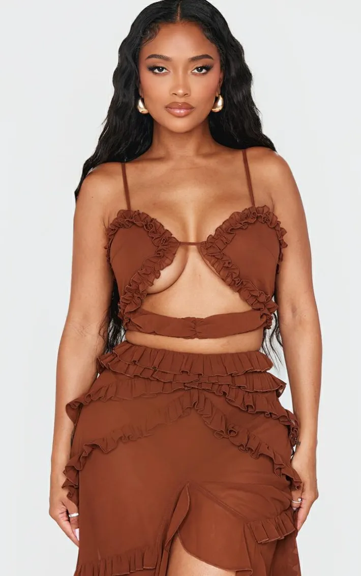 Reach for this shape chocolate frill edge cut out crop top whatever your weekend plans. Brought to you in a seasonal chocolate hue, with a luxe frill edge design and cut out detailing, this crop top is a must have in your collection. Team with the matching skirt and gold accessories to really make an impact.