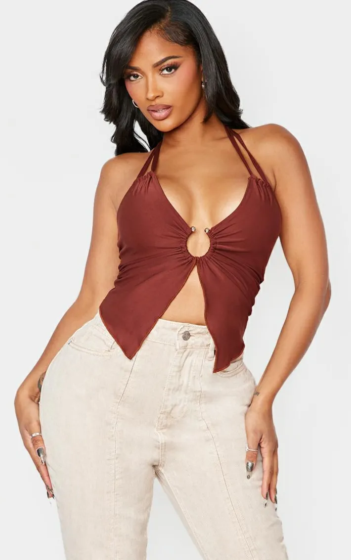 Bring all the drama to your weekend look with this shape chocolate slinky halterneck ring detail crop top. Made from a chocolate slinky material with a halterneck design, ring detailing and a cropped fit, we are obsessed. Style this slinky top with wide leg pants and heels for a look that is sure to have all eyes on you this weekend.