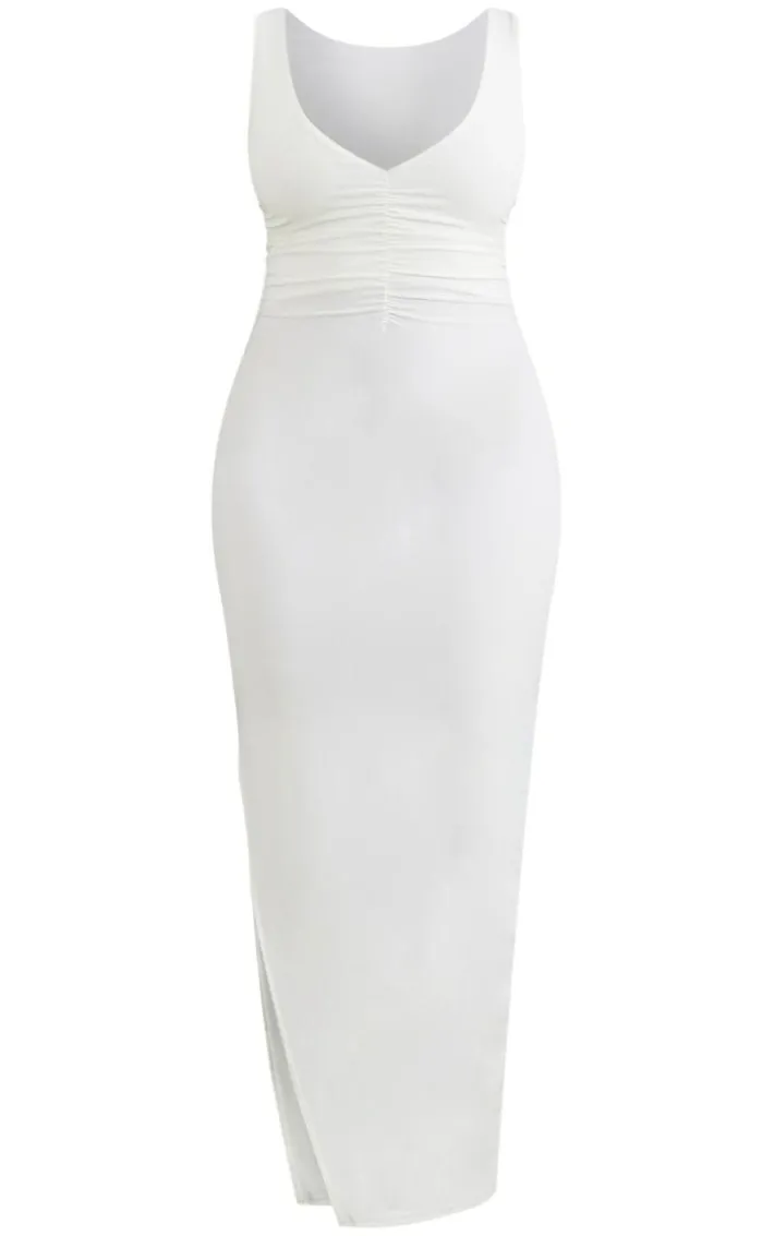 Make jaws drop this season with this statement midaxi dress. Featuring a cream slinky material with ruched bust detailing, a sleeveless design and a figure-worshipping fit, we are obsessed. Pair with high heels, a mini bag and accessories for a glam finish.