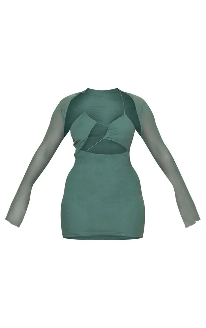 This dress is a sure to have all eyes on you this weekend. Featuring a deep green mesh material with a lace-up front design, overlay detail and a bodycon fit. Pair with barely-there heels for a fierce finish.