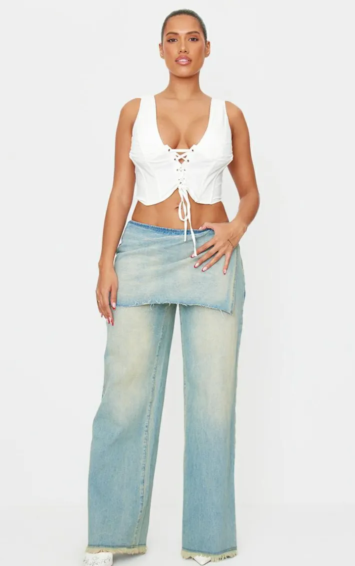 Switch up your weekend style game with these shape denim skirt look jeans. Brought to you in a denim material with a skirt look design, what more could you want? Style these denim jeans with a corset top and heels for a look that is sure to make heads turn wherever you go.
