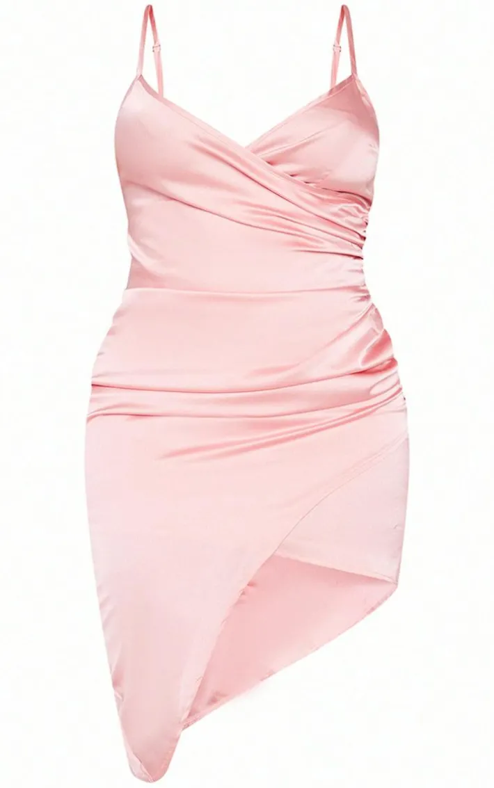 Be pretty in pink with this weekend worthy dress. Featuring a dusty pink satin material with a wrap over design, style with some lace-up heels and complete the look with statement accessories.