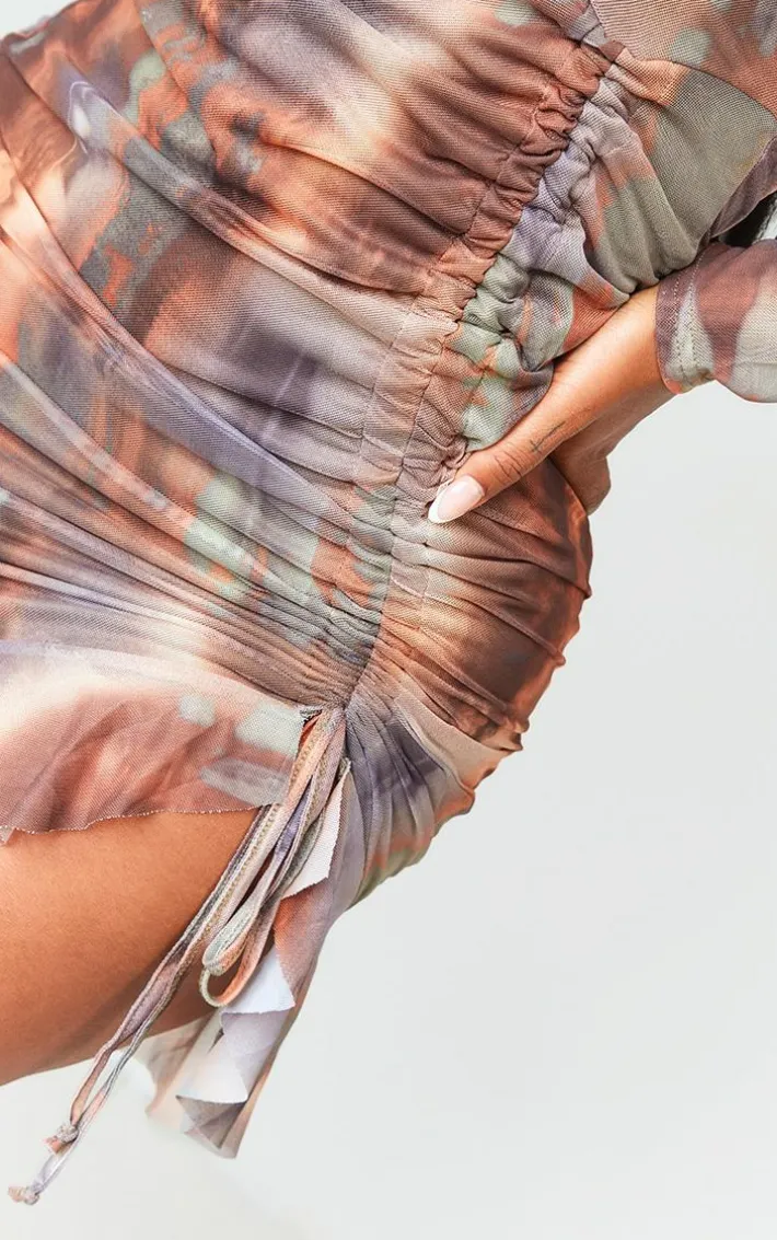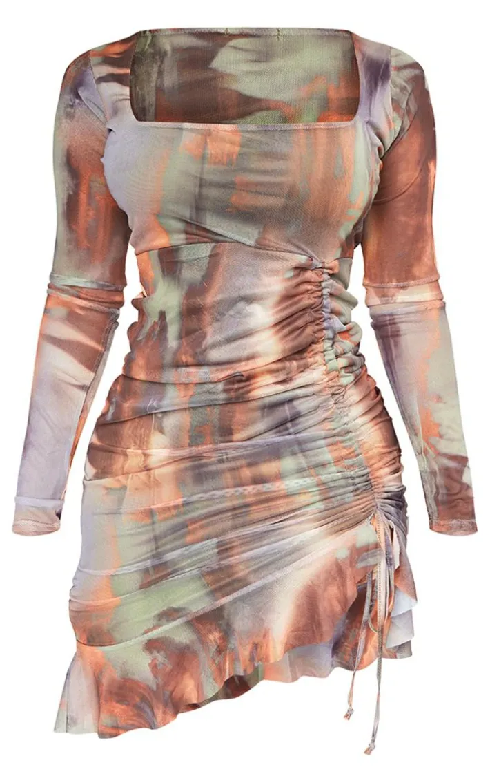Take the stress out of weekend styling with this shape green abstract mesh long sleeve ruched side frill hem bodycon dress. Brought to you in a green abstract print mesh material with long sleeves, a ruched side design and frill hem detailing, how can you say no? Style this bodycon dress with clear strap heels and gold accessories for a look that is sure to have eyes on you for all the right reasons.