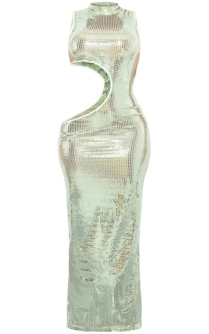 Channel all the glam vibes this weekend with this shape green mirrored sequin cut-out maxi dress. Made from a green mirrored sequin material with a cut-out detail, and a figure-hugging fit, how could you say no? This shape maxi dress is sure to turn heads for all the right reasons this weekend and we know you won’t be able to resist adding it to your basket. Team with clear heels and gold accessories to take your look to the next level.