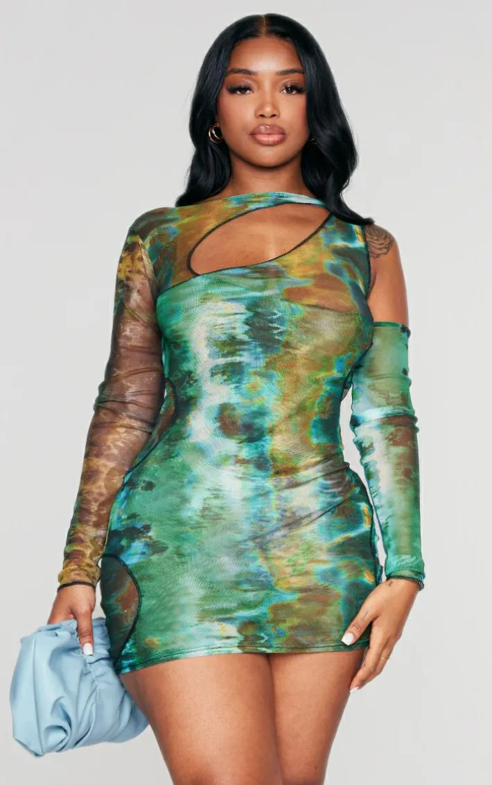 Get ready to make a statement with this shape green printed mesh asymmetric multi cut out long sleeved dress. Perfect for your weekend styling this dress is brought to you in a green mesh printed material with an asymmetric multi cut-out design and long sleeves, how could you resist? To complete the look style this women’s shape dress with a blue clutch bag and high heels. It’s a yes from us.