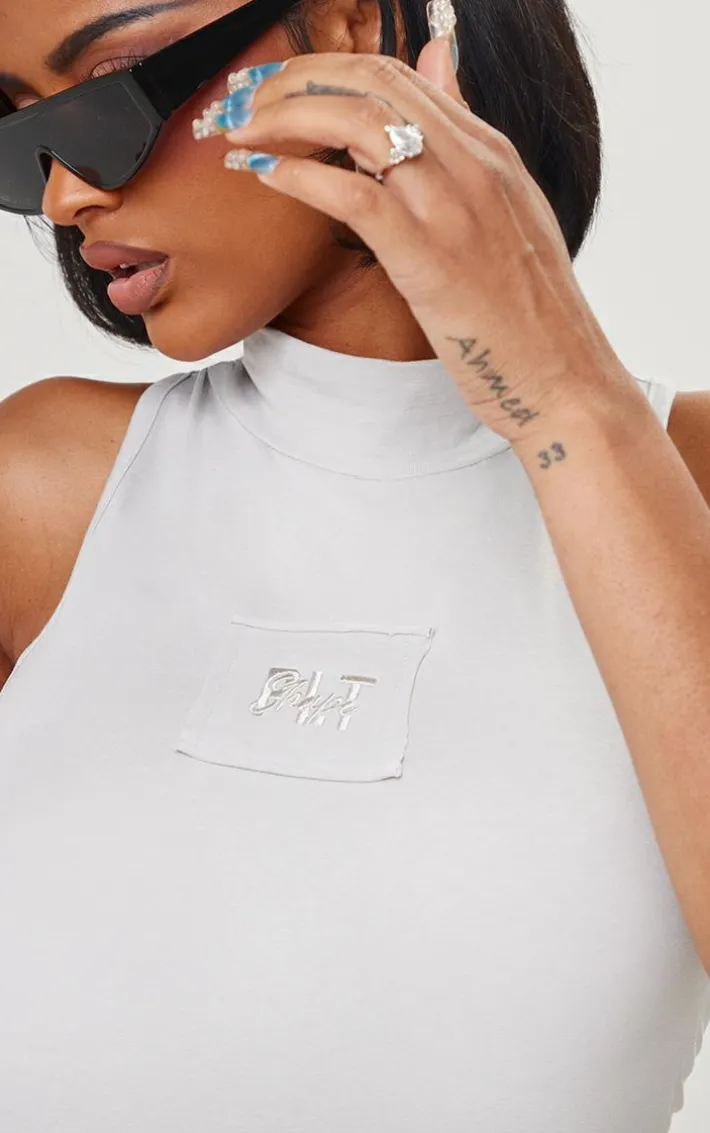 Give your basics collection a new season glow up with our shape grey cotton high neck sleeveless bodysuit. Brought to you in a cotton material for ultimate comfort, a high neck and sleeveless shape with a square embroided detail, what’s not to love? Pair with some wide leg sweatpants, heels and a statement bag to make heads turn for the right reasons.