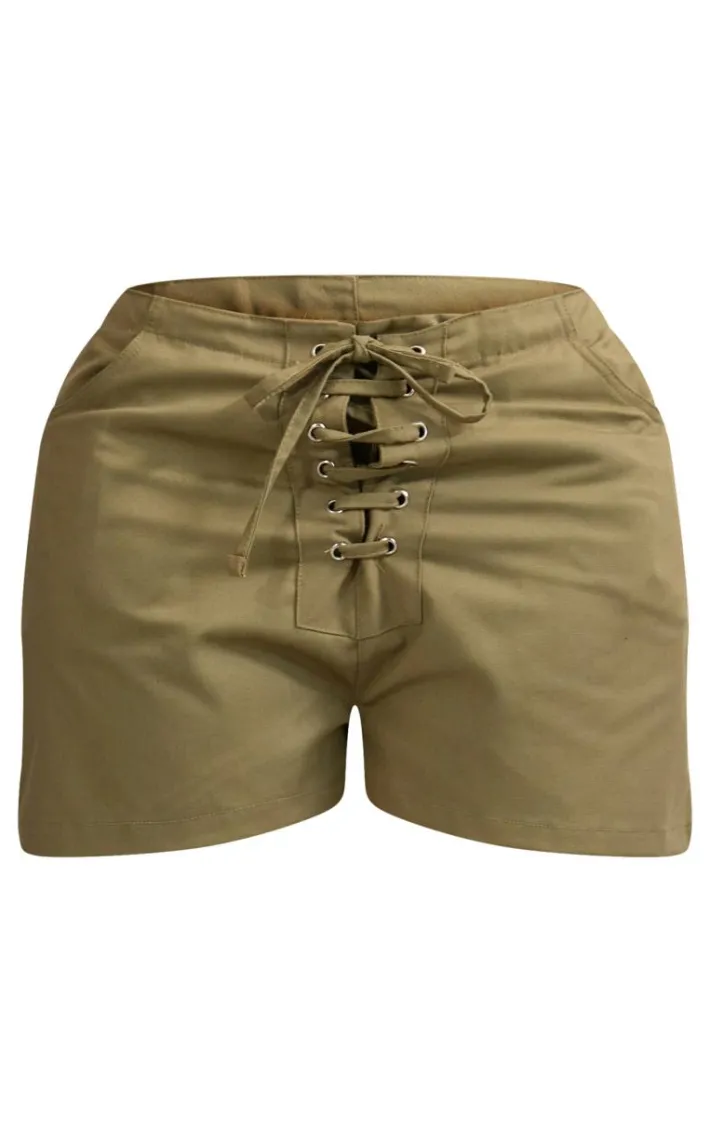 Add some flare to your wardrobe with these shape khaki lace up front twill shorts. Brought to you in a khaki twill material featuring a lace up front design, what’s not to love? Style these shorts with a white tee, heels and gold accessories for brunch , it’s a yes from us.