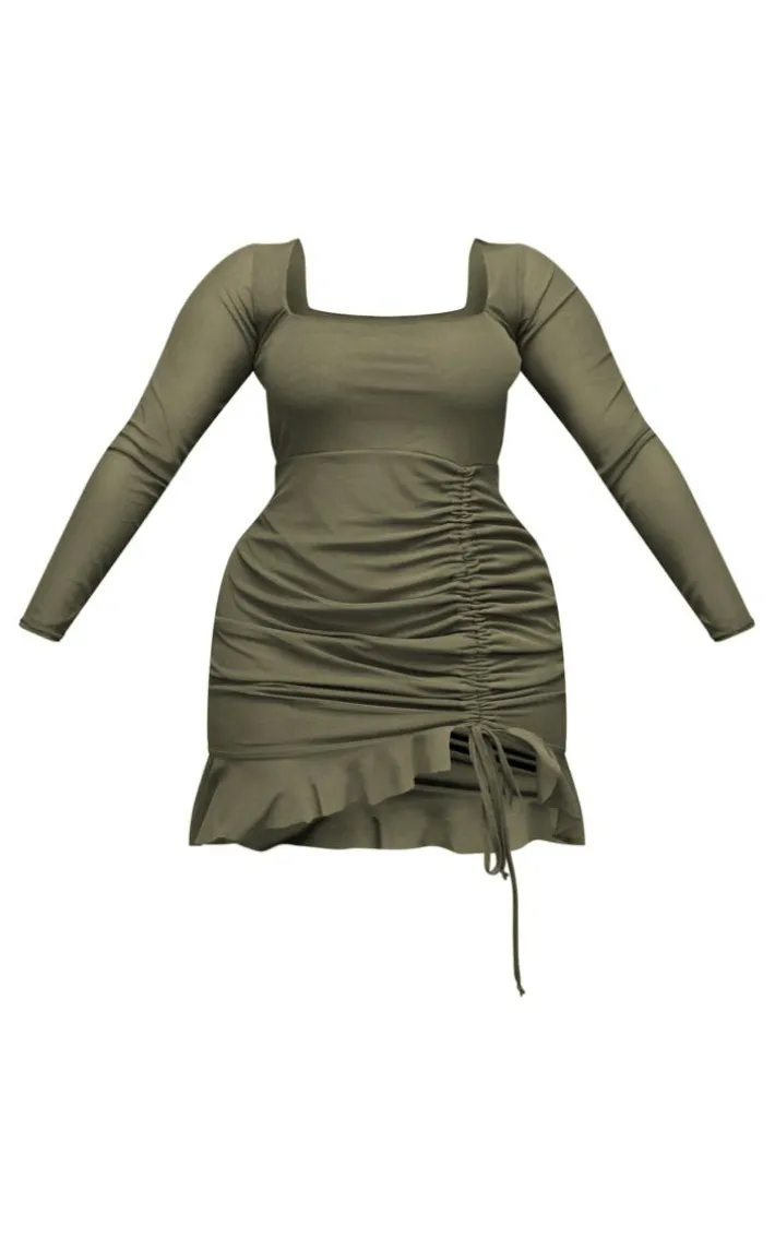 Channel the perfect weekend ‘fit with this shape khaki mesh long sleeve ruched side frill hem bodycon dress. Effortlessly chic and seriously figure-flattering, this bodycon dress is sure to show off your shape in all the right places. It is made from a khaki hue mesh material with long sleeves, a ruched side design and a frill hem. Style with your highest heels, accessories and a mini bag for a look that will really make a statement.