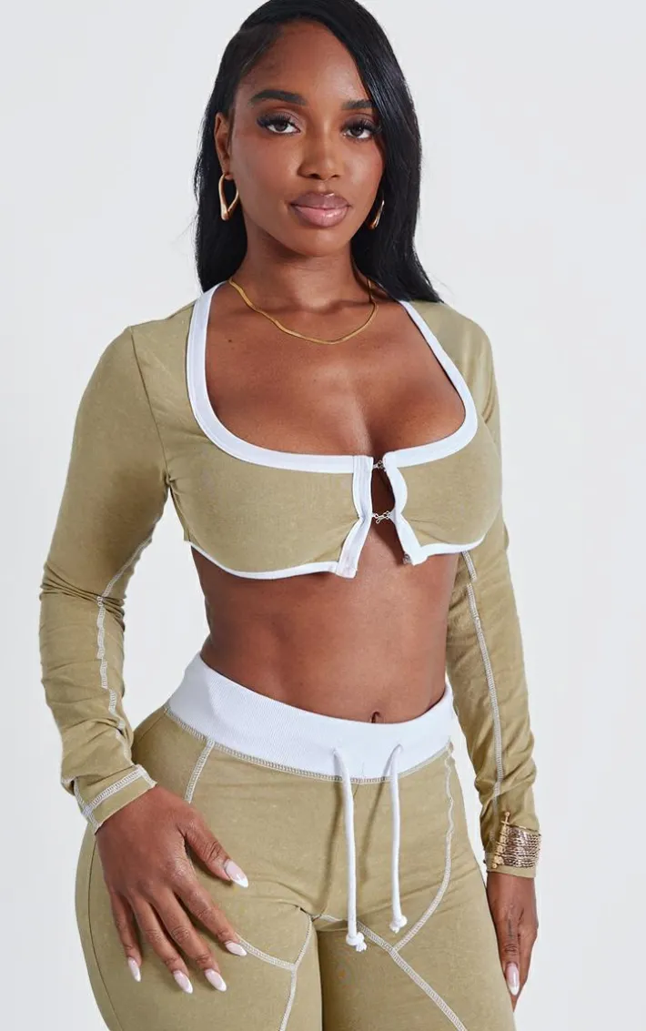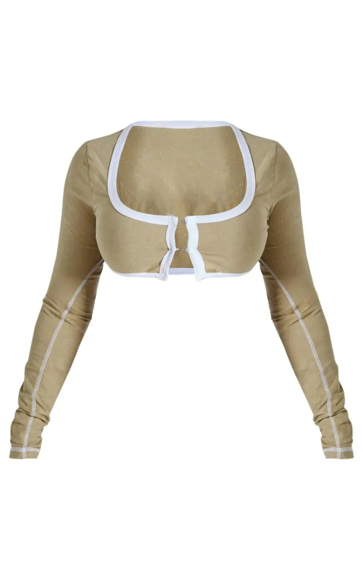 Get ready to show off your figure with this shape khaki wash cotton hook and eye long sleeve crop top. With an iconic khaki shade, a washed cotton material for extra comfort and hook and eye detailing, this top is made to be seen. Pair with the matching bottom and your fave accessories to stay on top of your style game.