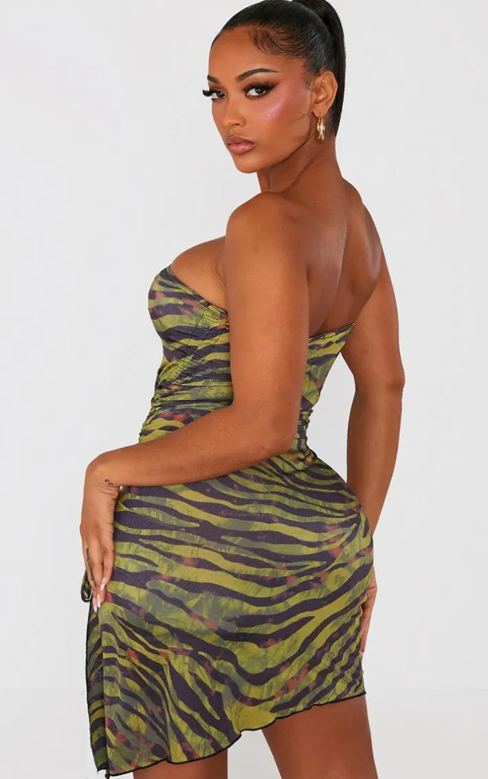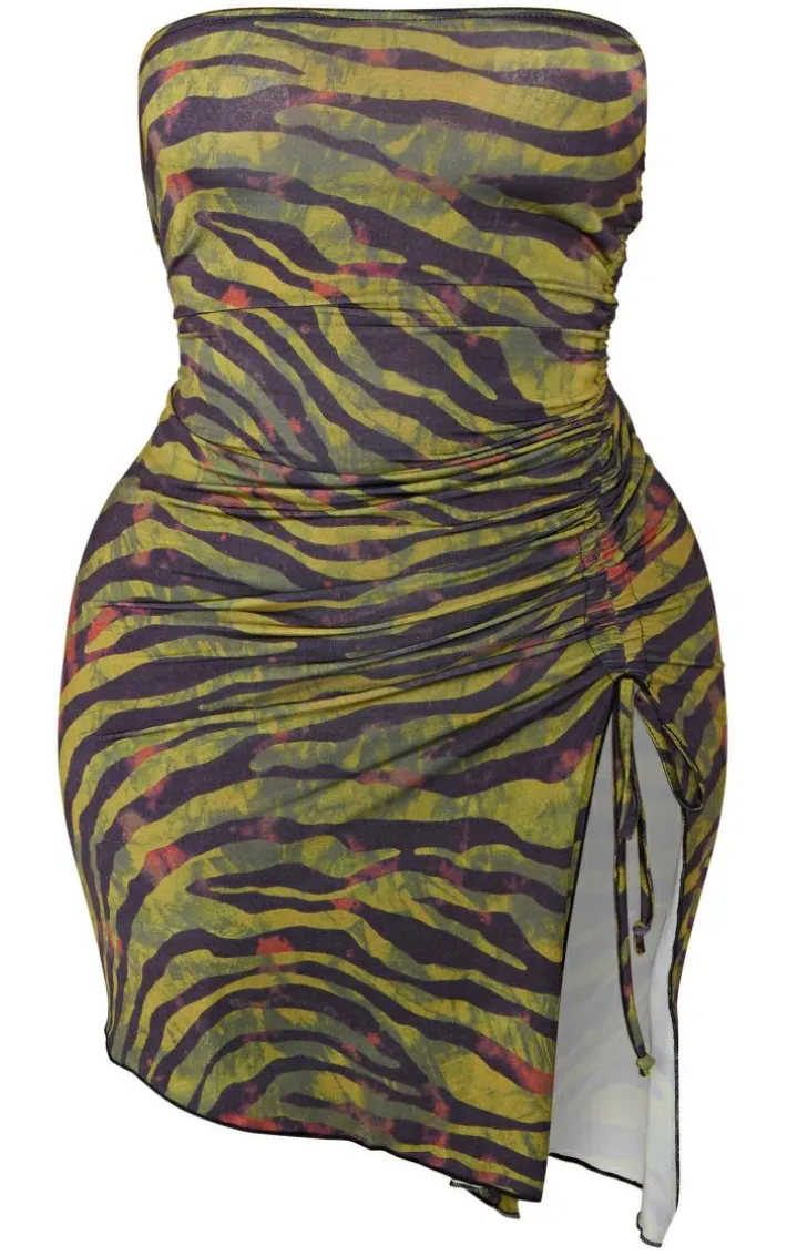 Your weekend outfit plans are calling out for this shape khaki zebra print slinky bandeau ruched side frill bodycon dress. Brought to you in a khaki slinky material with a zebra print design, we are seriously obsessed. This bodycon dress has a bandeau fit and a ruched side frill detail, it’s a definite yes from us. Team with a pair of heels and your go-to accessories for a look everyone is loving.