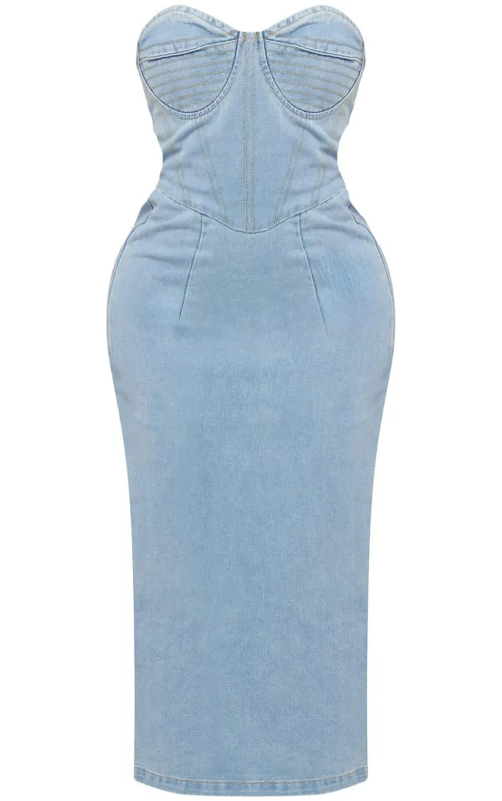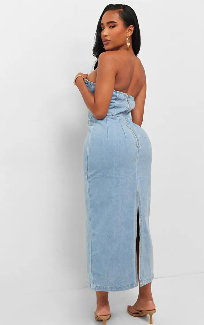 Calling all s, you’ll look unreal in this shape light blue denim seam bandeau maxi dress. Brought to you in a light blue denim material with a seam detail and bandeau neckline. It’s official, we’re obsessed. Stye this maxi dress with clear heels, gold accessories and a mini bag to steal all the stares.