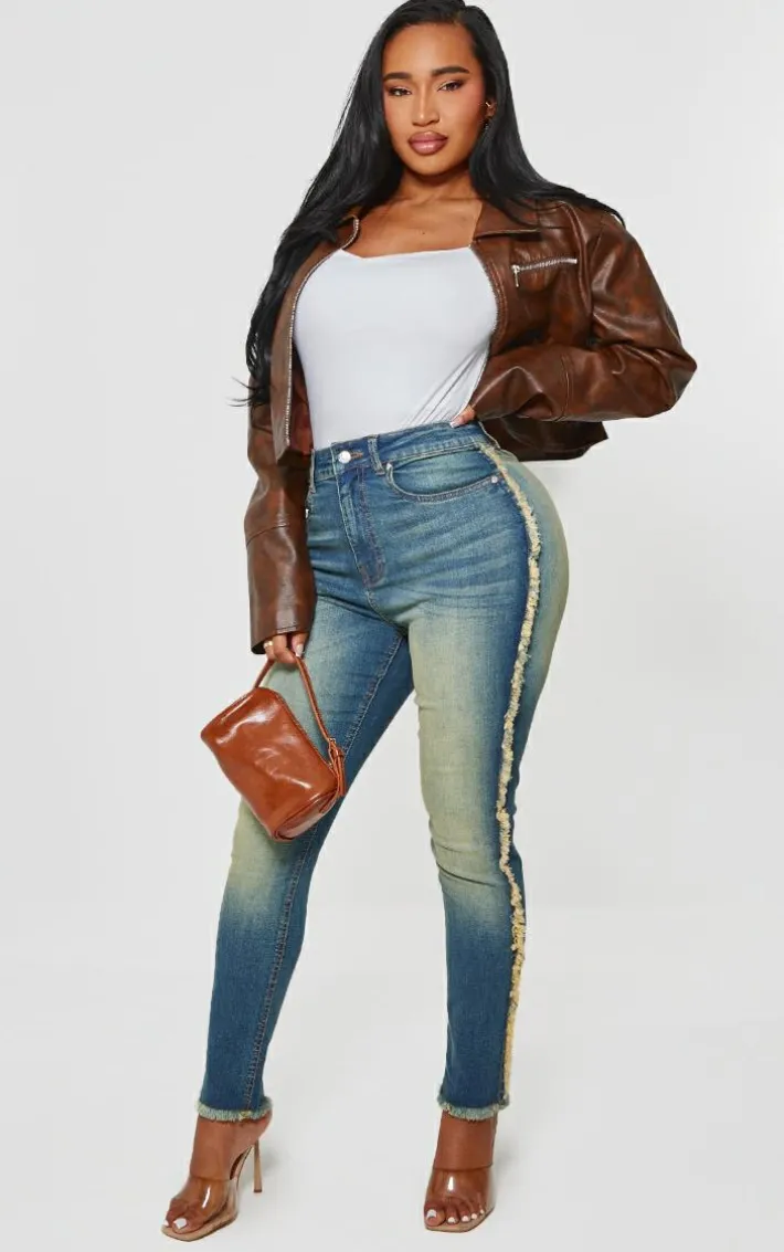For an effortlessly chic vibe, bag these shape light blue stretch denim fray detail skinny jeans. Brought to you in a dreamy light blue hue, with a stretch denim material and fray detail, how can you resist? Pair with a crop top and heels to really elevate the look.