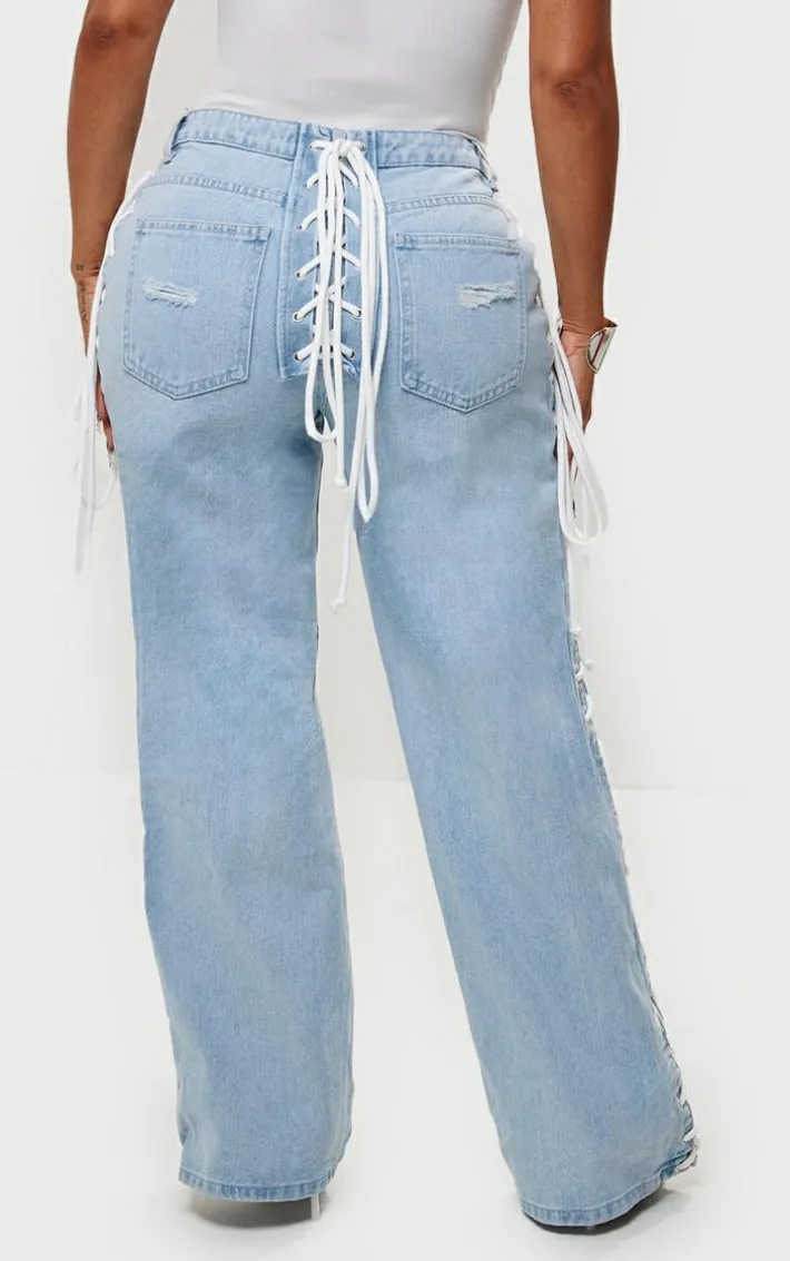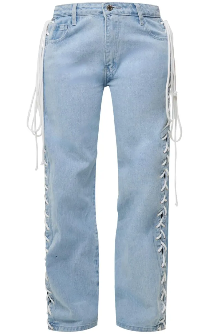 It’s official, we’re obsessed with these shape light blue wash denim lace up detail wide leg jeans. Brought to you in a light blue wash denim material with a lace up detail and wide leg fit, these jeans are a must have. How can you say no? Style with a white bodysuit, slip on heels and silver accessories for a look like no other. It’s a yes from us.