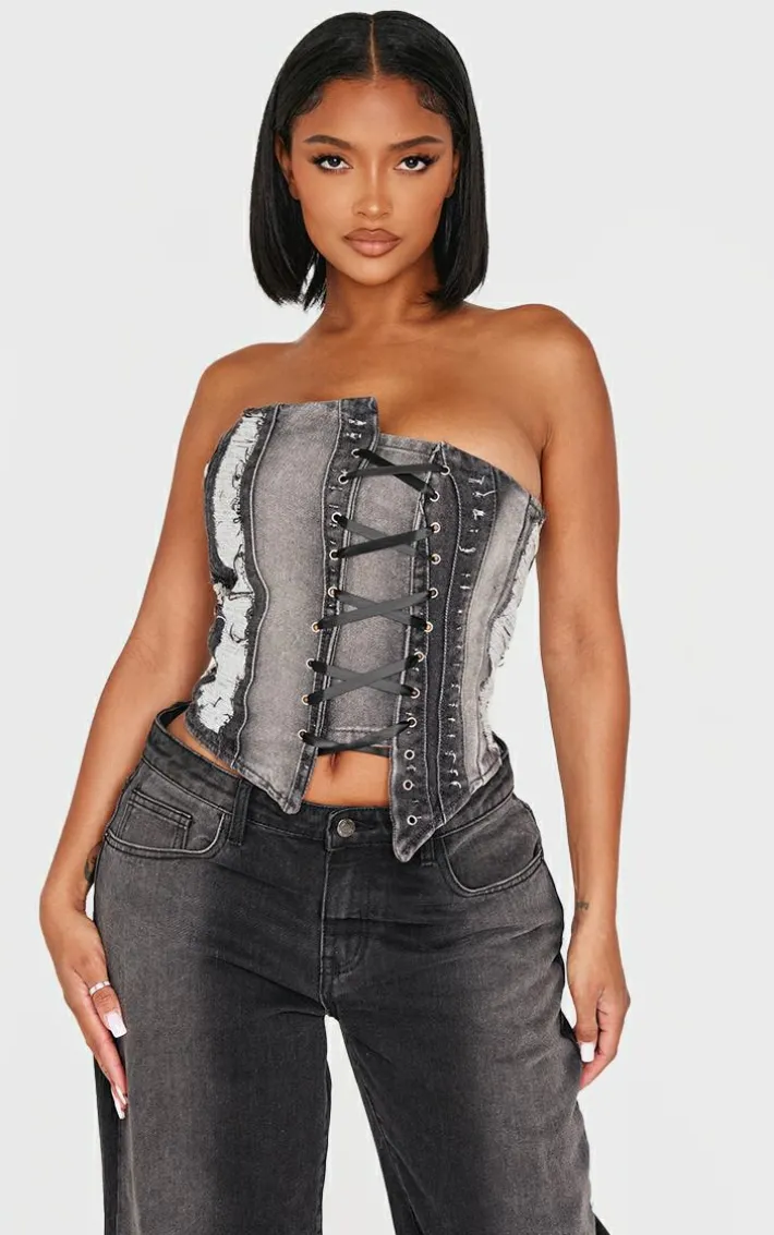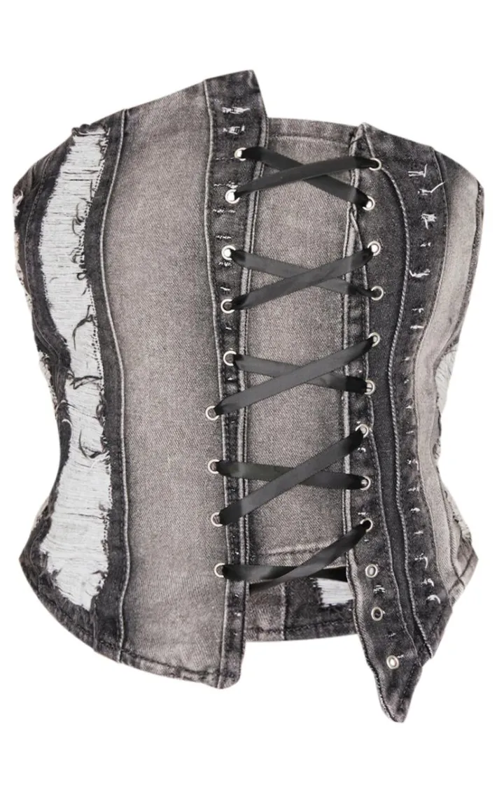 Take your look from day to night with this shape light grey denim bandeau distressed lace up detail corset. It’s made for those nights out where you’re unsure what to wear, with its fierce corset fit, lace up front design and light grey hue denim. Style with some denim jeans, heels and your best accessories.