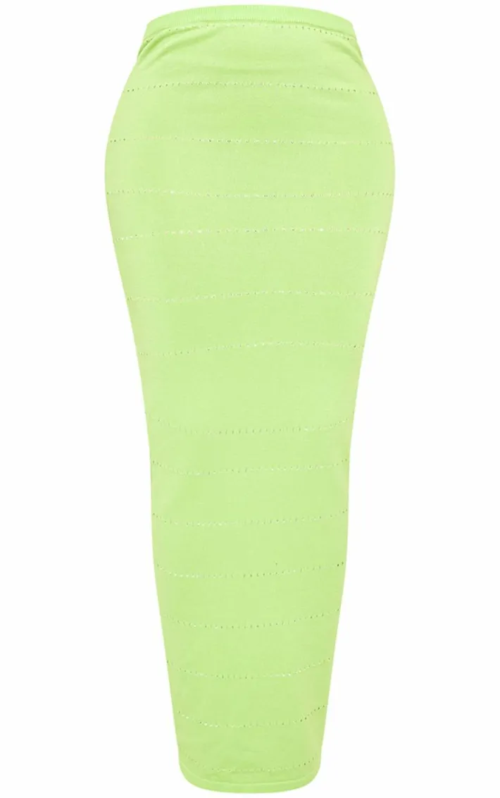 We’re totally in love with this shape lime knit low rise maxi skirt for your weekend plans. It is made from a lime knit material with a low rise and a maxi length, how could you not be obsessed? This maxi skirt gives you endless styling potential and is bound to give your look that extra chic touch. Style seamlessly with the matching top, clear heels and gold accessories for a seriously luxe finish.