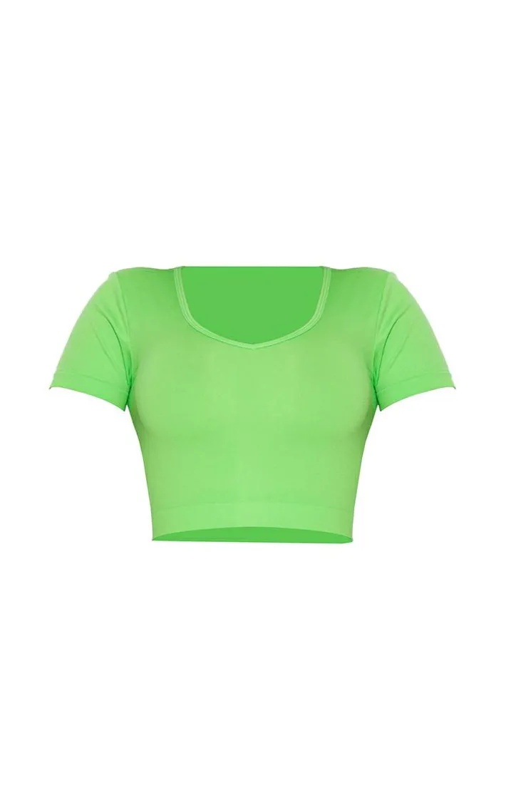 Take your chilled days on in style with this shape lime stretch seamless scoop neck crop t shirt. Brought to you in a lime stretchy material with a scoop neck, a cropped length and a seamless design, we canÂ’t stop crushing on this t shirt. To complete the look pair this with your outfit of the day and accessories. ItÂ’s a yes from us.