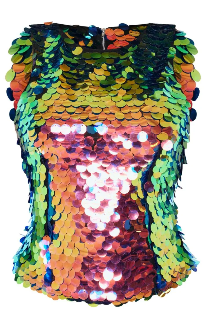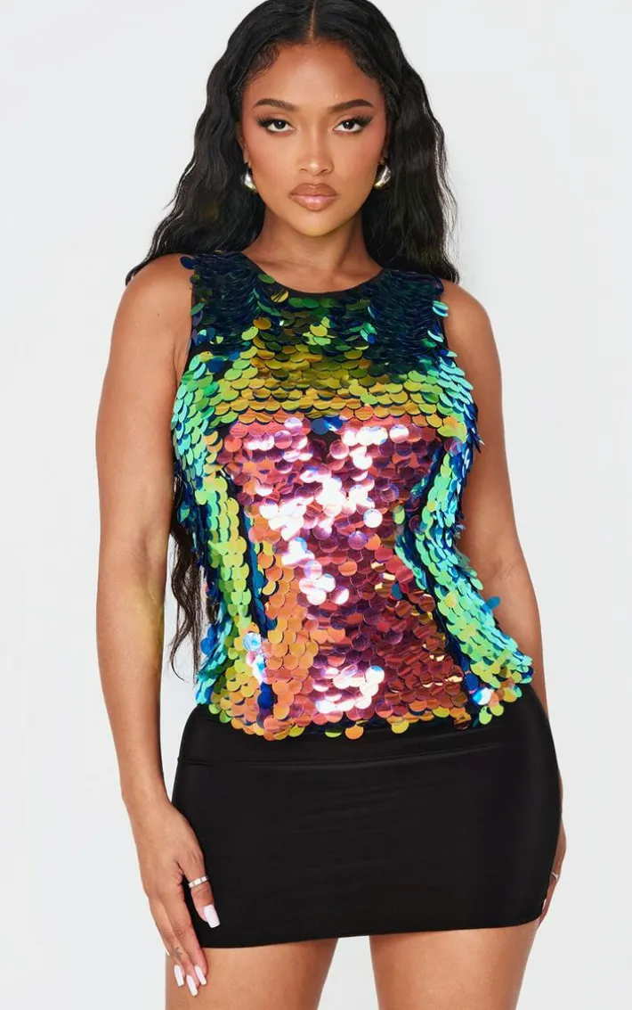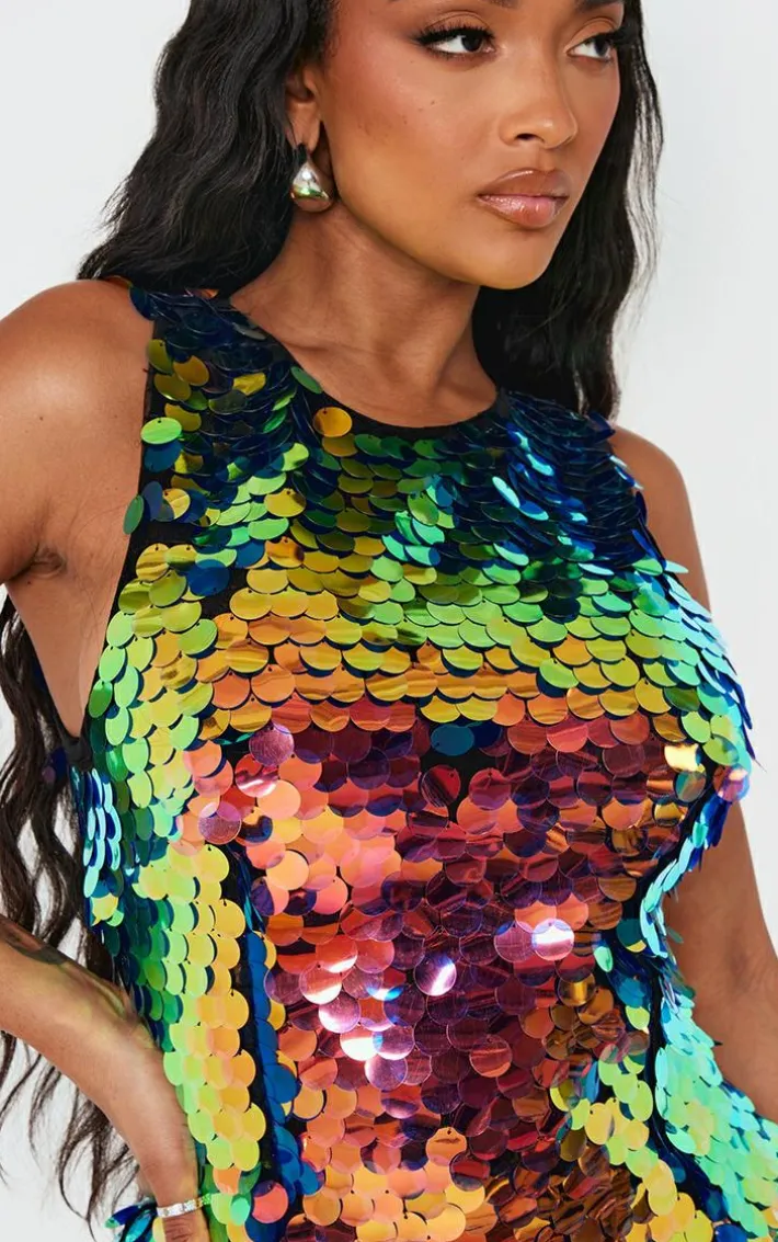 Steal all the stares in this shape multi neon iridescent sequin longline top. Brought to you in a multi hue neon material with an iridescent sequin detail, this longline top is a must have for all your styling needs. How can you resist? Style with a mini skirt, black strappy heels and gold accessories for a statement finish everyone will be asking about.