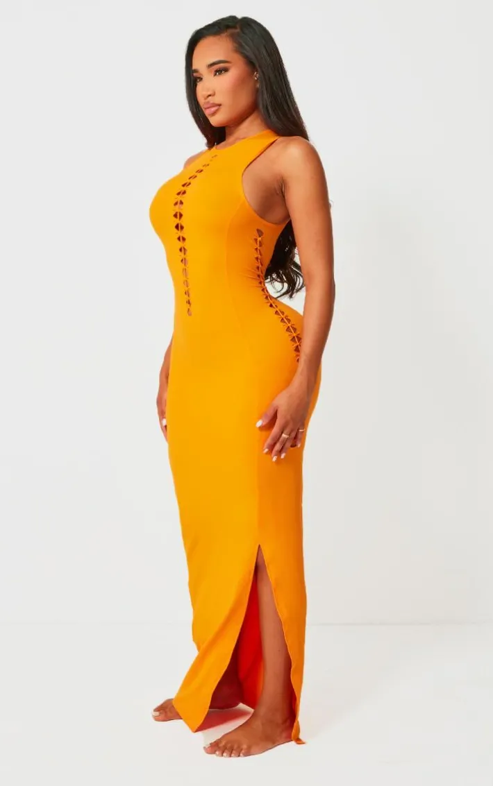 Dare to go bold this season with this statement shape neon orange soft sculpted cut out side maxi dress, you’re sure to be at the center of attention. This shape dress features a neon orange material with a cut out side design and a sculpted style. Just add heels and your go to accessories for a look that will make them stop and stare.