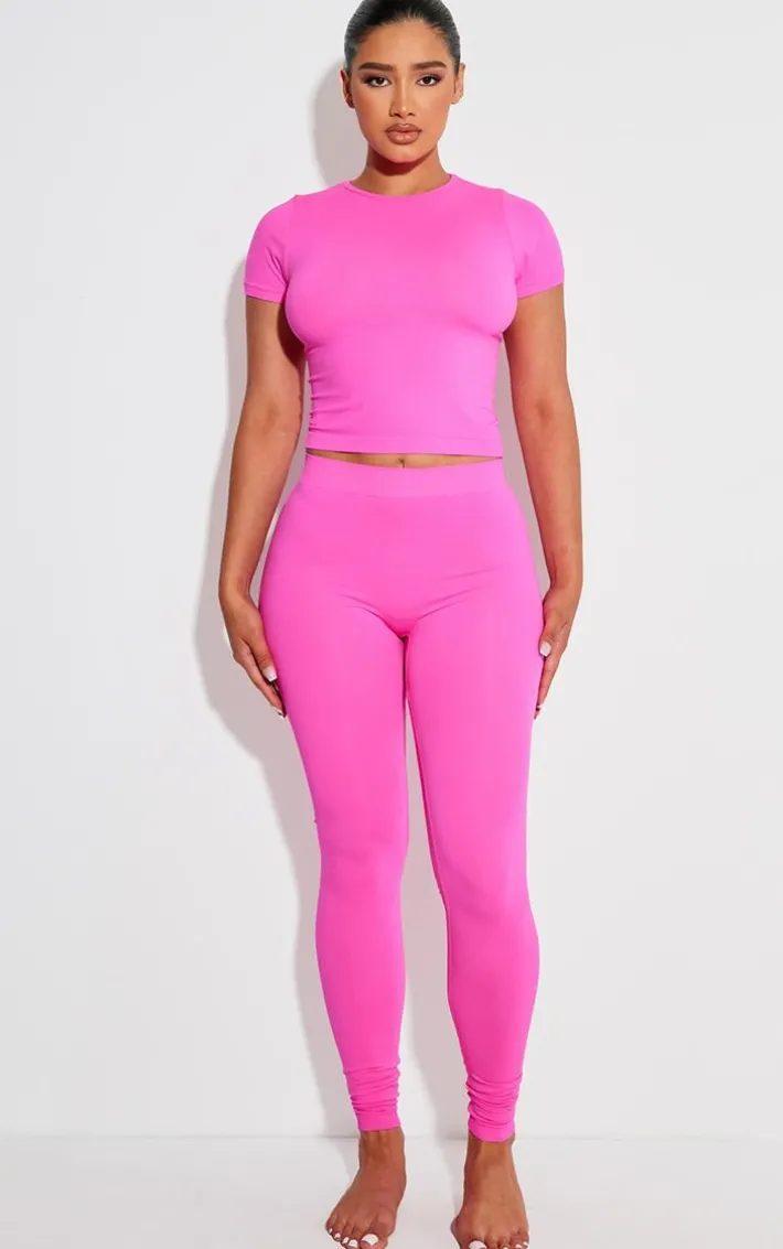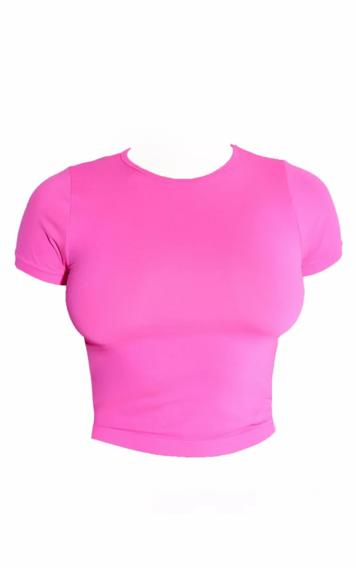 Get your sweat on in this shape neon pink stretch seamless short sleeve longline top. Brought to you in a neon pink stretch material with a seamless design, short sleeves and longline length, how can you say no? Simply style this top with the matching leggings, box-fresh kicks, and accessories for all the likes.
