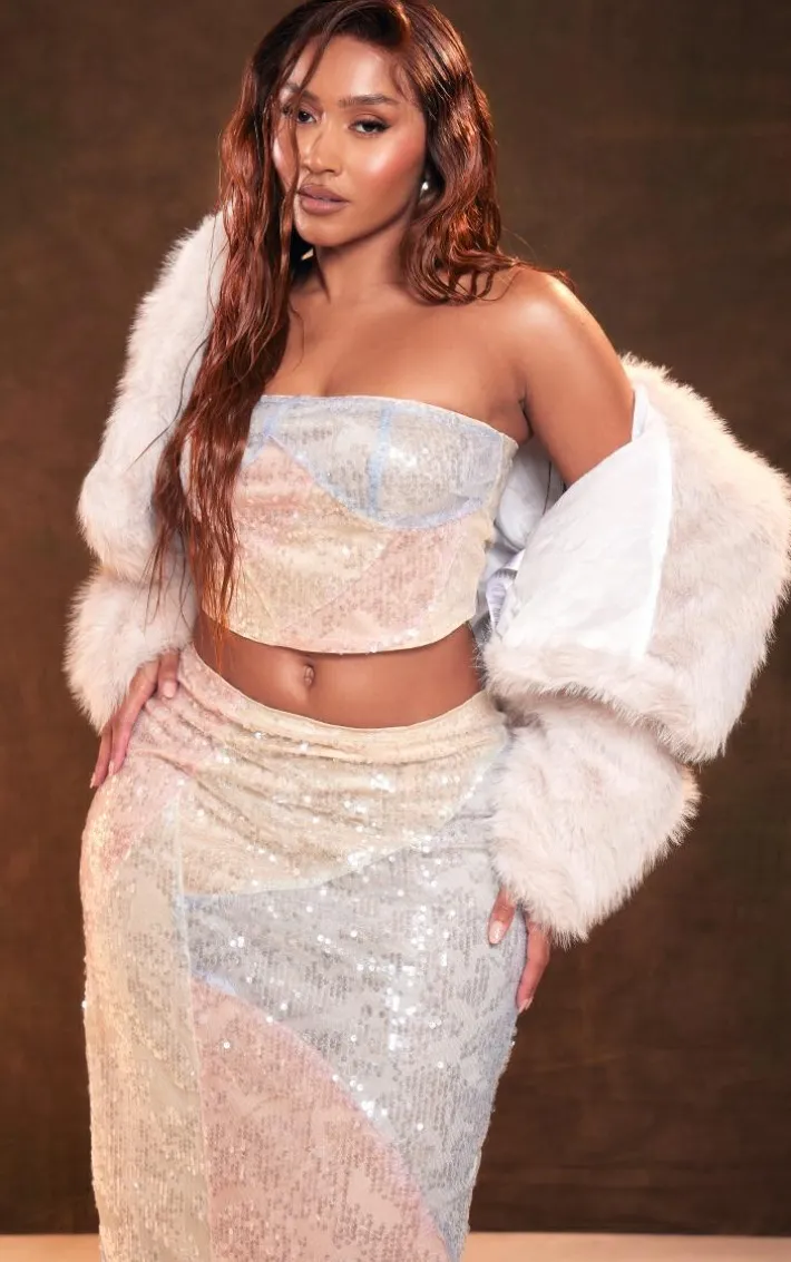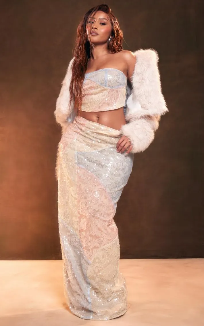 Take your occasion-ready wardrobe that extra mile with this shape nude ombre sequin split back maxi skirt, get ready to be at the center of attention. With a nude ombre sequin material, a split back design and a figure-flattering fit, everyone will be obsessing over this shape skirt. Pair it with the matching top, a faux fur jacket and your highest heels for a look no one will forget.