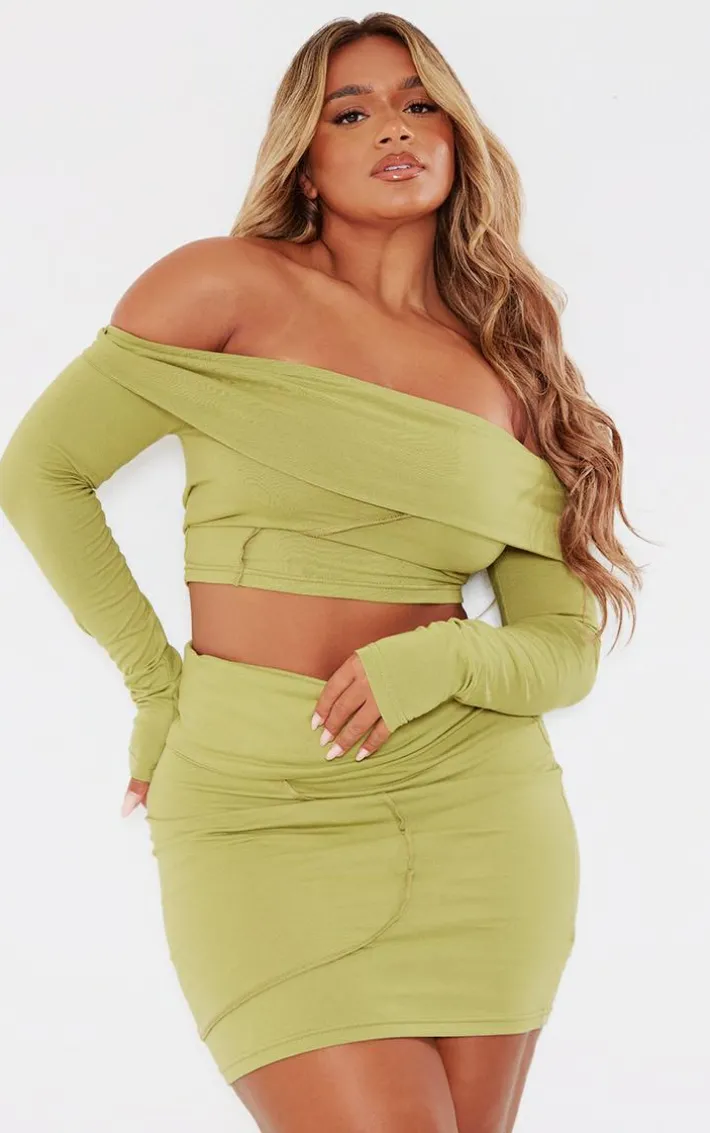Add some of this season’s must-have hue to your weekend wardrobe with this shape olive bardot seam detail crop top, you’re sure to be earning all the likes. Made using an olive hue material with seam detailing and a a bardot style, how could you not be in love with this shape crop top. Pair it with the matching skirt, your fave heels and simple accessories for a dreamy date night look.