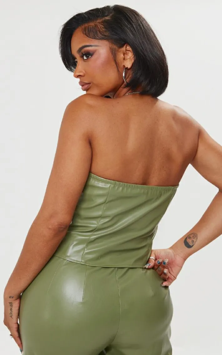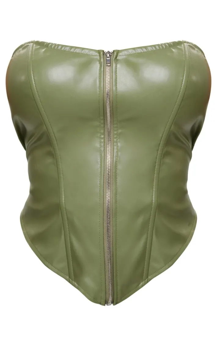 Take your weekend look to new heights with this shape olive faux leather zip front corset. Brought to you in an olive hue faux leather material with a zip front design and a flattering corset fit, how can you resist? Style this faux leather corset with the matching pants, heels and gold accessories for a look that is sure to steal all the stares.