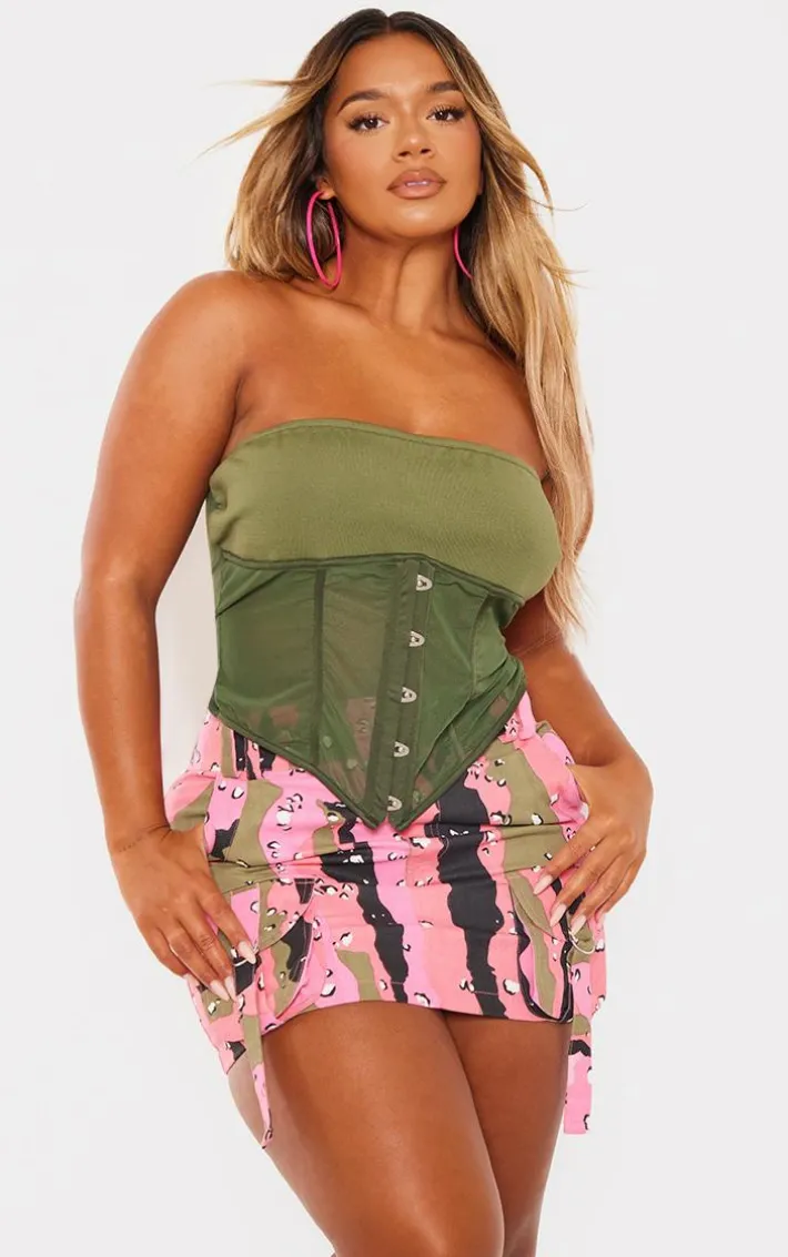 Give your weekend wardrobe the update it deserves with this shape olive hook and eye bandeau detail bandeau crop top. Brought to you in an olive hue material with a bandage design, a bandeau neckline , hook and eye detailing and a cropped fit, how can you resist? Style this crop top with a mini skirt and clear strap heels for a fierce weekend-worthy look perfect for your next night out.