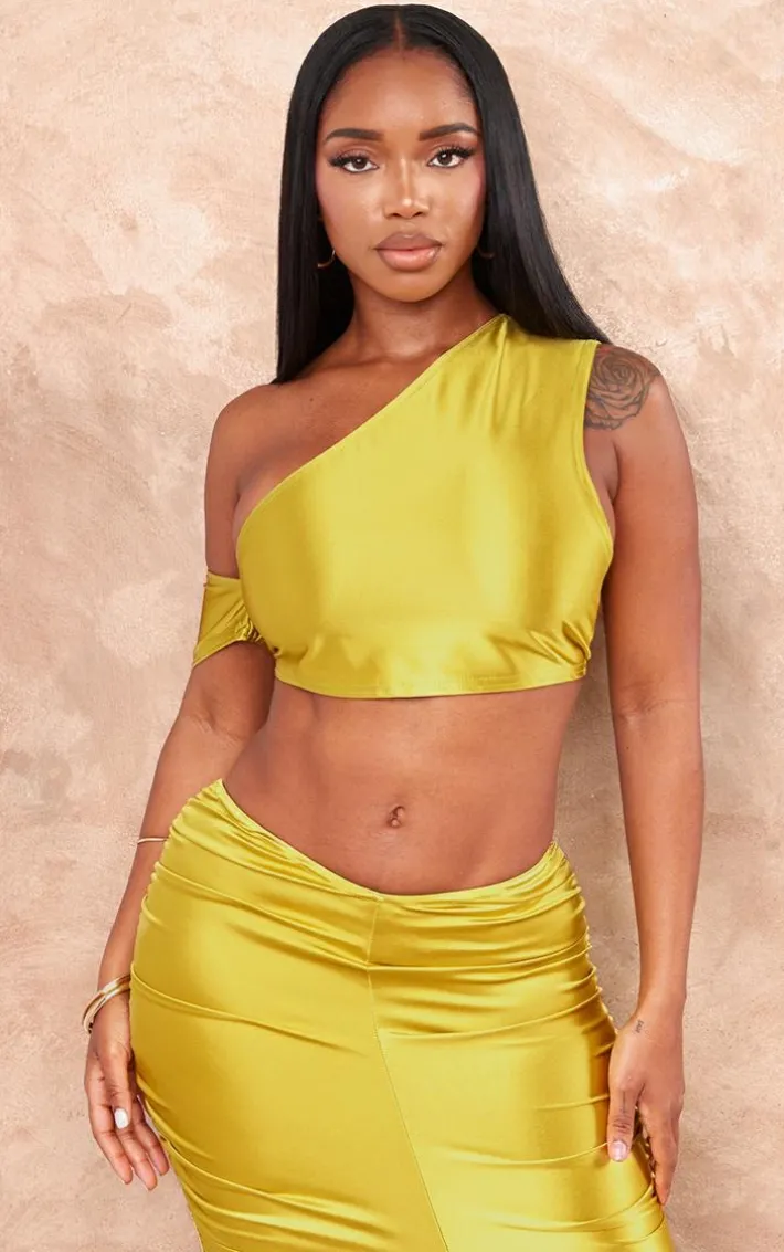 Bring all the luxe satin feels to your weekend look with this shape olive satin one shoulder crop top. Made from an olive hue satin material with a one shoulder design and a cropped fit, what more could you want? Style this crop top with the matching skirt, heels and gold accessories for a look that is sure to make you stand out from the rest.
