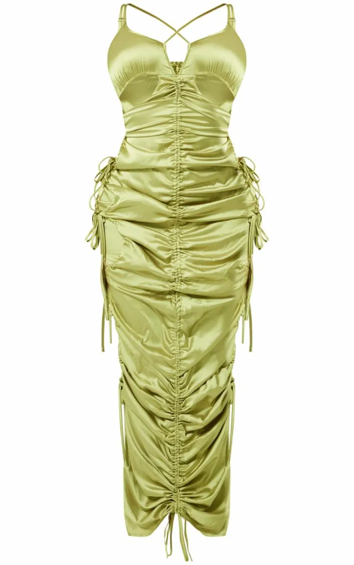Get ready to have all eyes on you with this shape olive satin ruched strappy detail maxi dress. Brought to you in an olive satin material with ruched detailing, a strappy design and a maxi length, whatÂ’s not to love? With itÂ’s figure-hugging fit youÂ’ll sure to earn all the likes with this dreamy piece. Finish off the look by pairing this with clear high heels and your statement accesosries. ItÂ’s a yes from us.